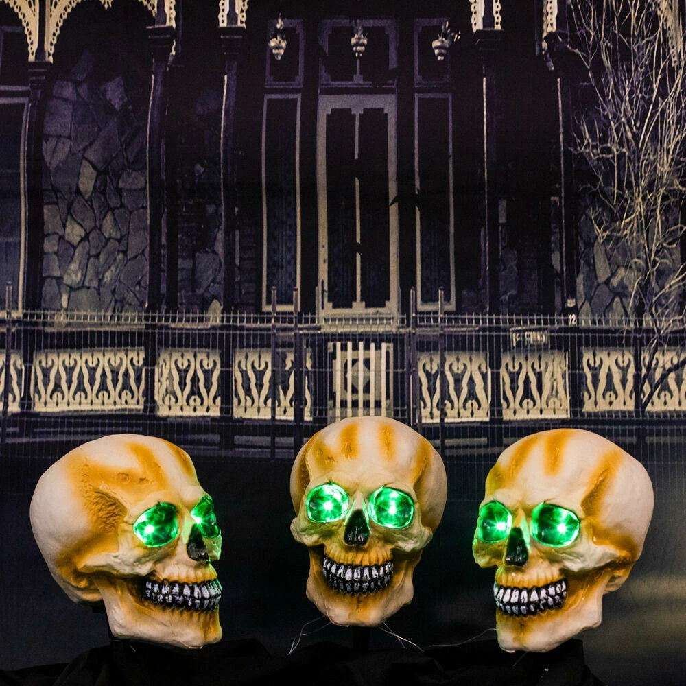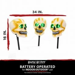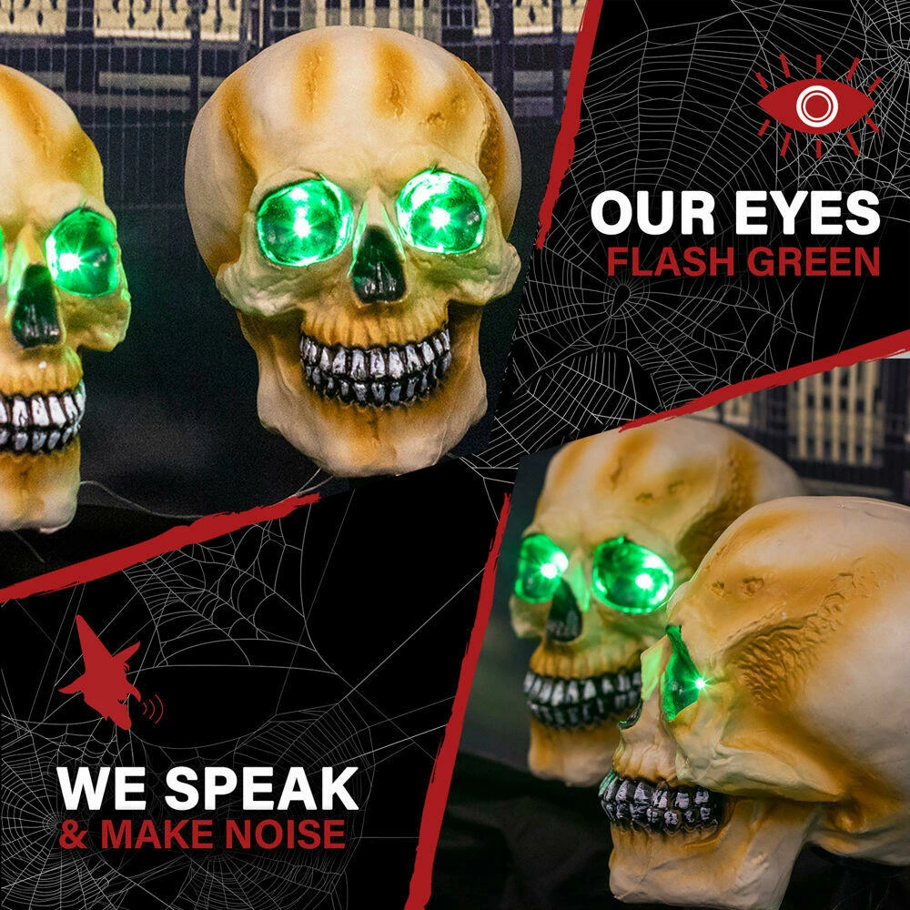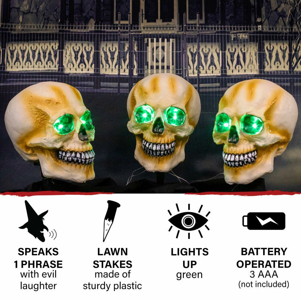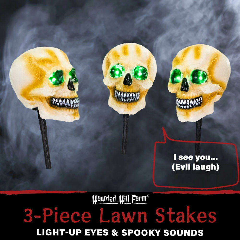 - Connected 3-piece skull lawn stakes come to life to step up your Halloween display