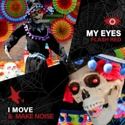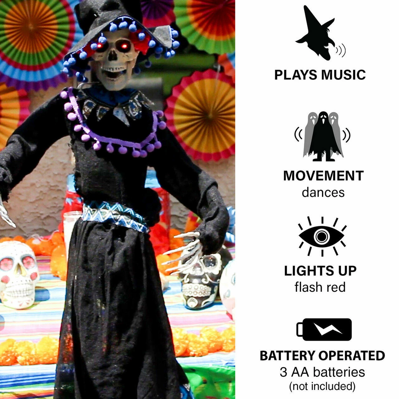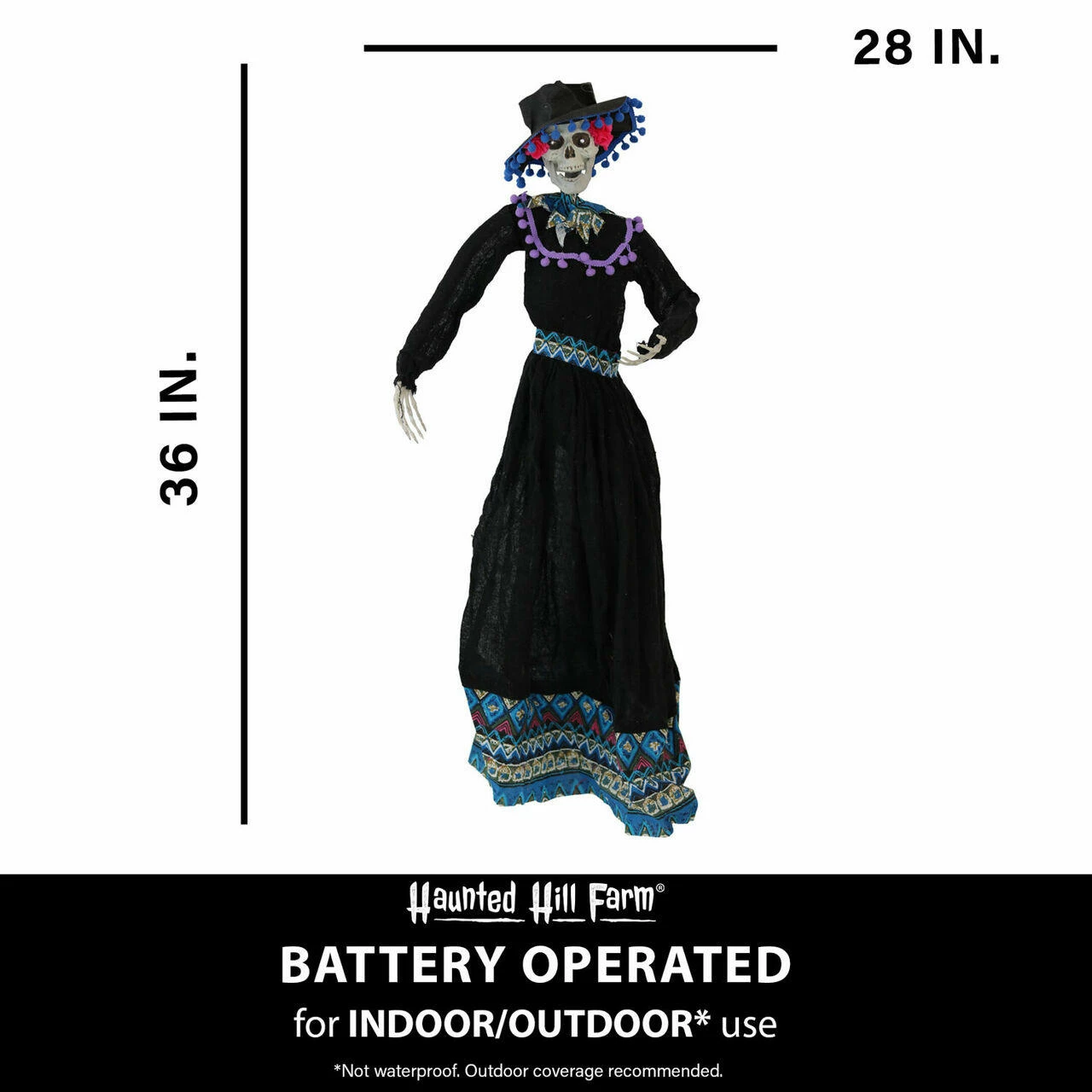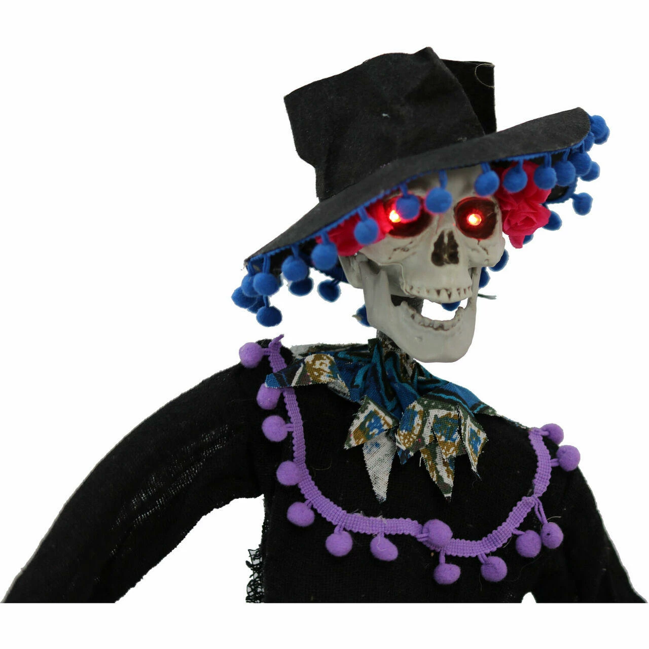- 36-in. sugar-skull inspired Day of the Dead decorative skeleton lady with flashing red eyes, music, and dancing