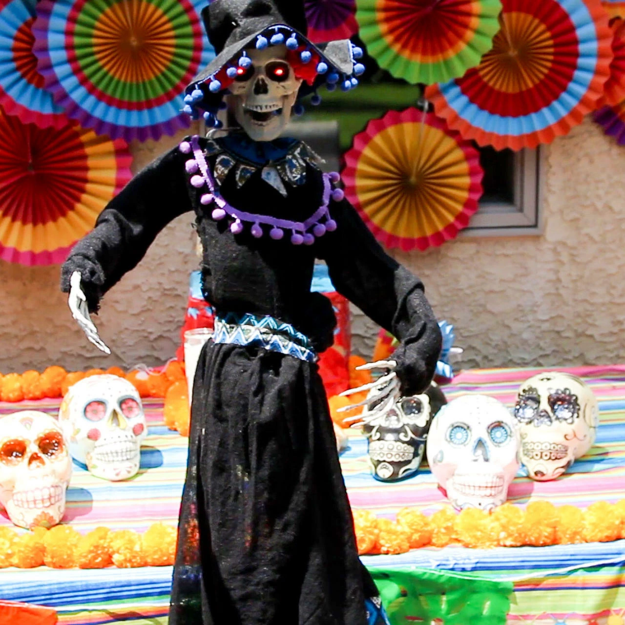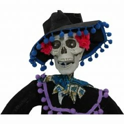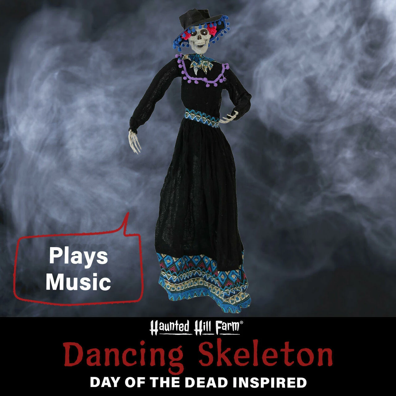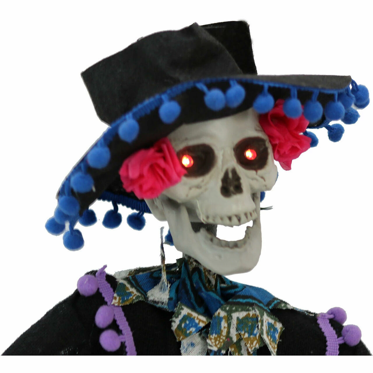 - 36-in. sugar-skull inspired Day of the Dead decorative skeleton lady with flashing red eyes, music, and dancing
