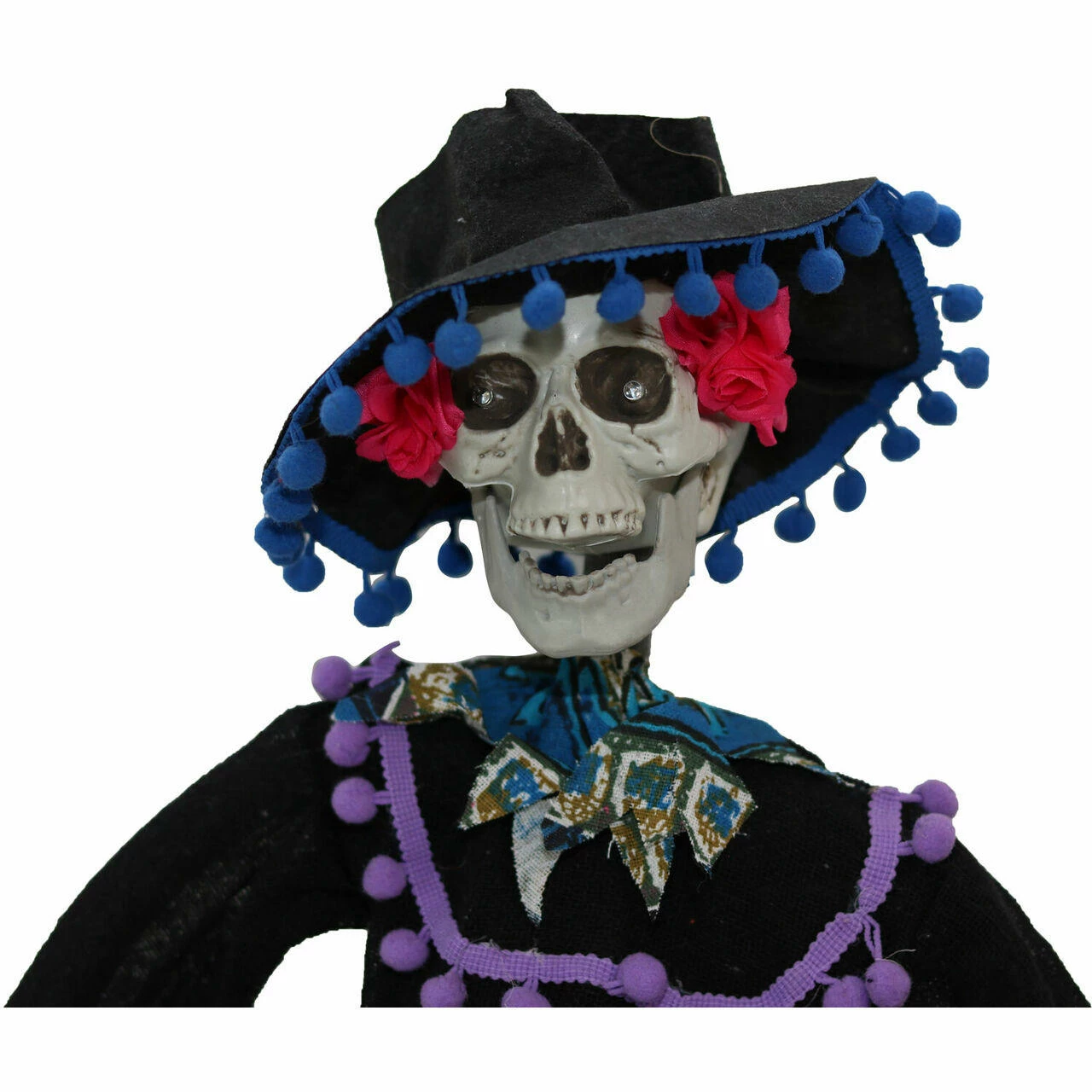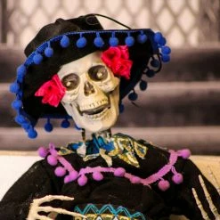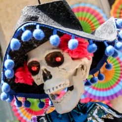 Celebrate and honor the exquisite holiday of Día de los Muertos with this intricate, sugar-skull inspired, decoration from Haunted Hill Farm. This ornate skeleton lady can be the perfect final addition to any Day of the Dead or Halloween decorations. The vibrant and eye-catching colors of blue, black, and purple contrast perfectly with the solid off-white of the skull. The skeleton dances while festive music is played and her eyes flash a brilliant red. The bendable arms allow this skeleton to be placed in many positions and comes with a convenient hanging loop. The lightweight and compact features allow for the skeleton lady to be placed next to your altar, decorations, or candy dish. Honor this beautiful celebration with a sugar-skull inspired skeleton from Haunted Hill Farm.