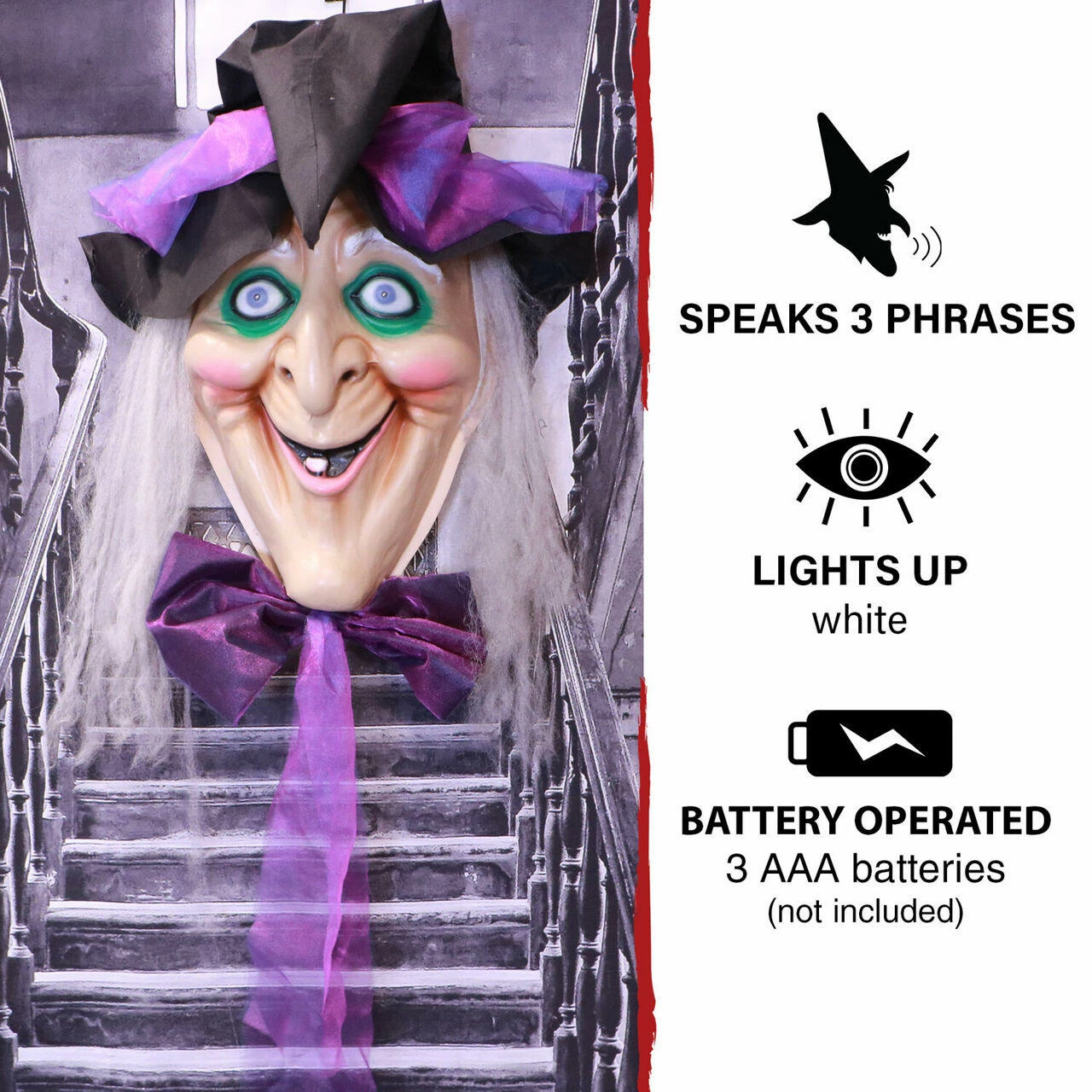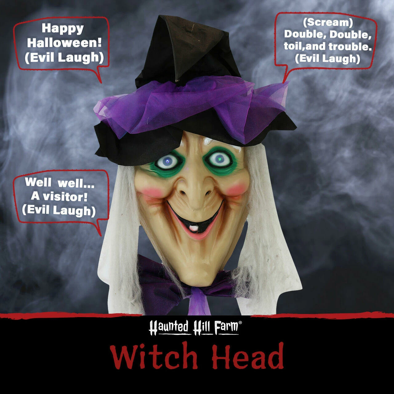 - Witch head is touch activated – talks and eyes light up white