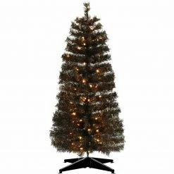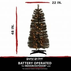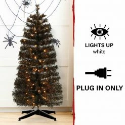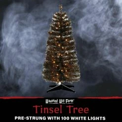Add a little extra spook to your Halloween with this haunted 3-ft. black tinsel tree from Haunted Hill Farm. This ghostly tree will make an eerie statement in any room it’s placed in from the moment you unbox it. Black tinsel needles populate each branch and reflect light from every angle. Warm white LED lights are evenly distributed throughout the tree and provide extra light to the frightening display. Metal-hinged branches make it easy to unfold each tier and begin fluffing. These metal branches are extra-durable and designed for many years of bending and folding in and out of storage. A matching metal tree stand is included to secure the tree upright. This tree can excellently fit on your porch, in your haunted house, or yard. Our Haunted Hill Farm tinsel tree is the final nail in the coffin for your decor this Halloween!