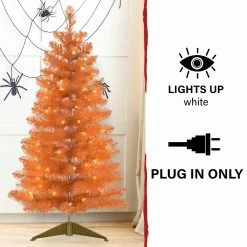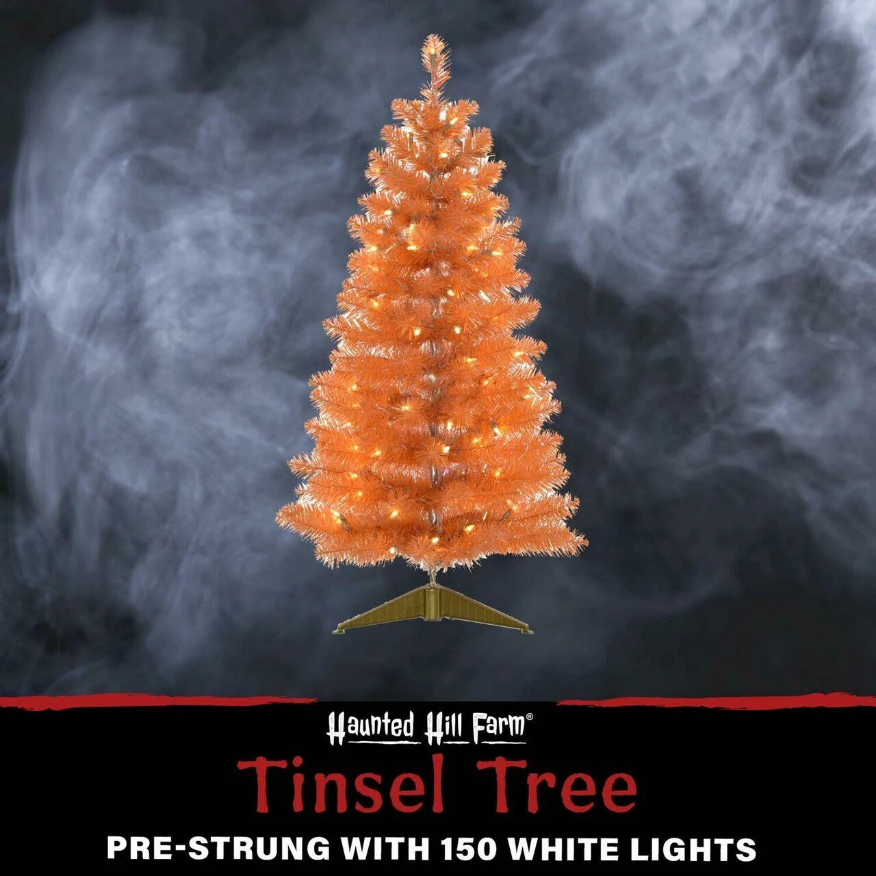 Add a little extra spook to your Halloween with this haunted 4-ft. orange tinsel tree from Haunted Hill Farm. This ghostly tree will make an eerie statement in any room it’s placed in from the moment you unbox it. Orange tinsel needles populate each branch and reflect light from every angle. Warm white LED lights are evenly distributed throughout the tree and provide extra light to the frightening display. Metal-hinged branches make it easy to unfold each tier and begin fluffing. These metal branches are extra-durable and designed for many years of bending and folding in and out of storage. A matching metal tree stand is included to secure the tree upright. This tree can excellently fit on your porch, in your haunted house, or yard. Our Haunted Hill Farm tinsel tree is the final nail in the coffin for your decor this Halloween!