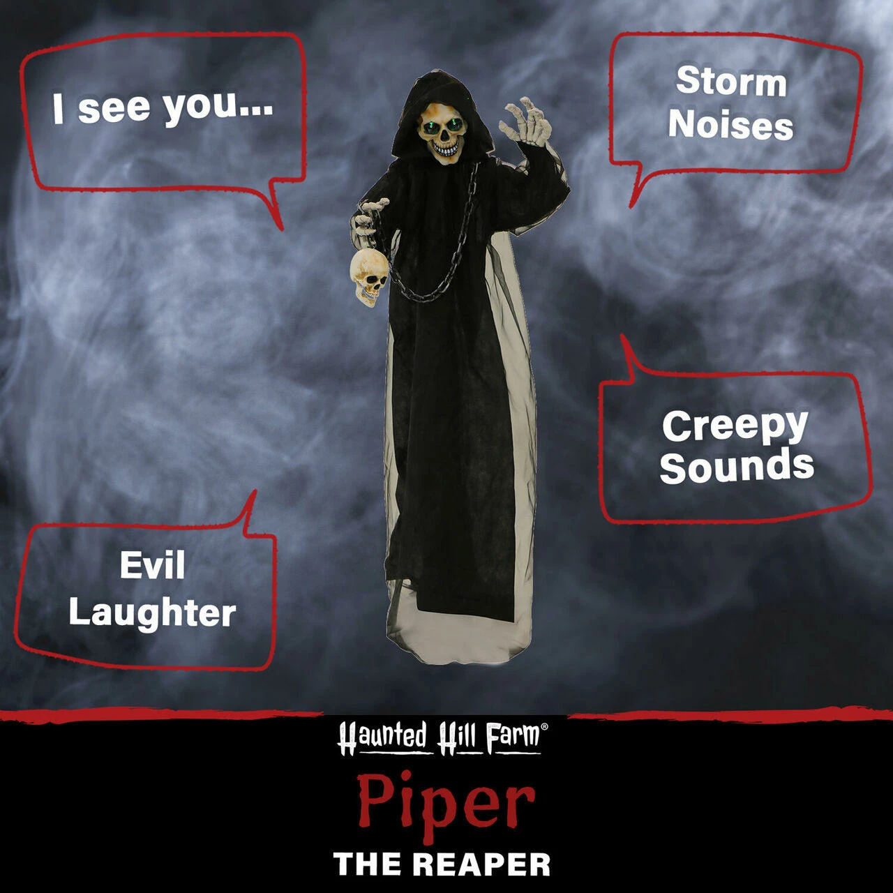 Be afraid. Be very afraid of Haunted Hill Farm’s Reaper Collection. These blood curdling creatures are sure to terrify any trick-or-treaters, co-workers, or customers. Masked beneath a black cloak, Piper the Reaper blends into the darkness. His haunting laughter and thunder sounds will terrify any passerby. Concealed beneath his robes, Piper’s eyes illuminate the night with green light, exposing his toothy evil skeleton and wicked gaze. His poseable arms bend into a variety of positions and are complete with alarming, talon-like hands. Piper even carries a souvenir of his past endeavors with him; he clasps a skull and chain in his gruesome grip, flaunting his vicious victories. Keep an eye on Piper as you roam the night-he’s keeping an eye on you. “I see you??