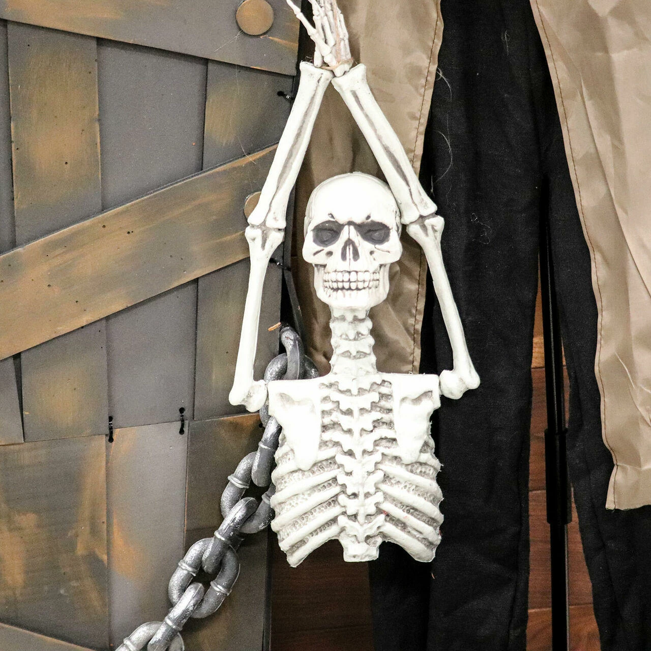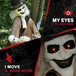 Be afraid! Be very afraid of Haunted Hill Farm’s Lawn of the Dead collection. These blood-curdling creatures are sure to terrify any trick-or-treaters, co-workers, or customers. Jebediah Bones, the gravekeeper’s ghoulish face, is the first thing you’ll notice when his unsettling red eyes light up in the night, illuminating his creepy smile. Go a little closer, and you’ll awaken the senses that cause him to sway his arms and head eerily while his terrifying laugh rings through the air over the wails of his victim and strikes of lightning. Jebediah’s skeleton prop tops off his horrifying appearance as a warning of exactly what he’s capable of. Bring him home, if you dare.