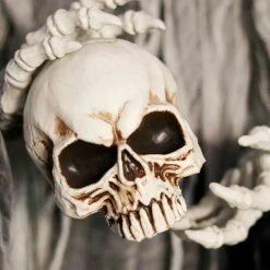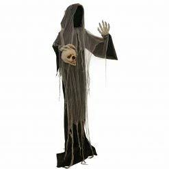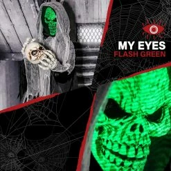 Be afraid! Be very afraid of Haunted Hill Farm’s Reaper Collection. These blood-curdling creatures are sure to terrify any trick-or-treaters, co-workers, or customers. Silence may be a ghoul of few words, but wherever he rests, there will be no shortage of screams. This life-sized skeleton reaper will horrify visitors with his light-up green face, sinister smile, and sharp, talon-like hands. Bend Silence’s hands into various terrifying positions; extend them outwards to display the skull he grips in his hands. No matter where he stands, his presence will be felt by all. Invite Silence to your home this Halloween, but be warned. It’s not candy he wants to collect.