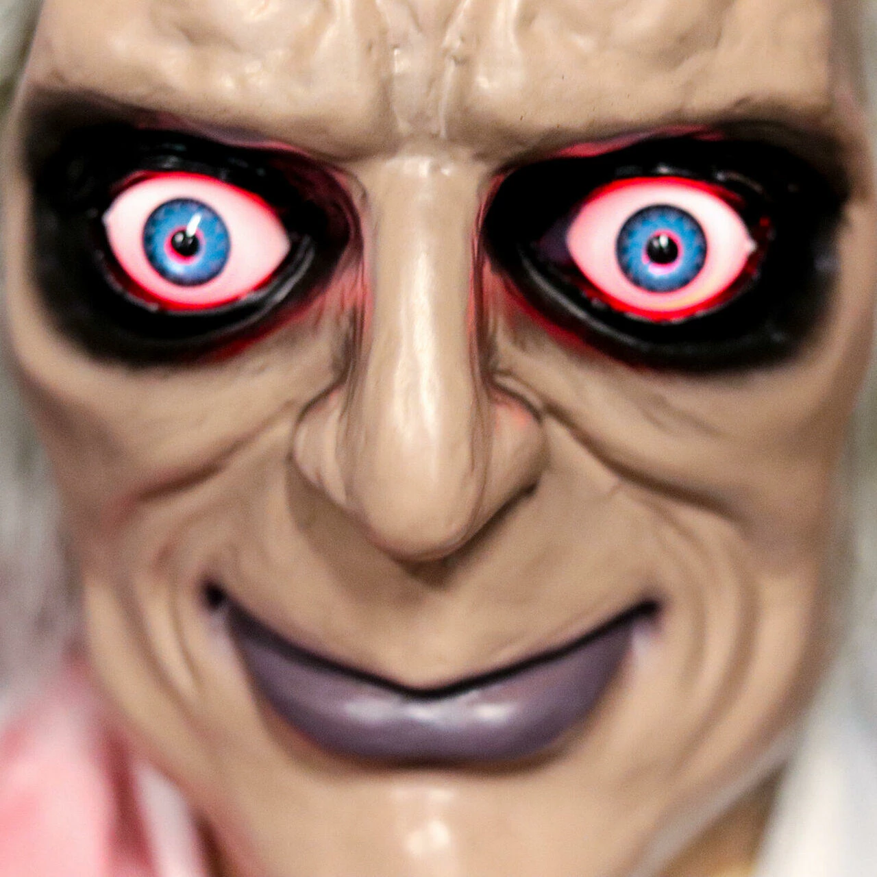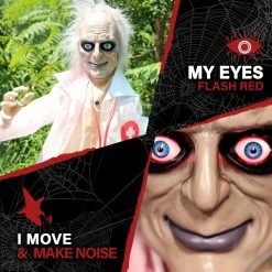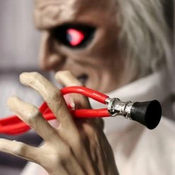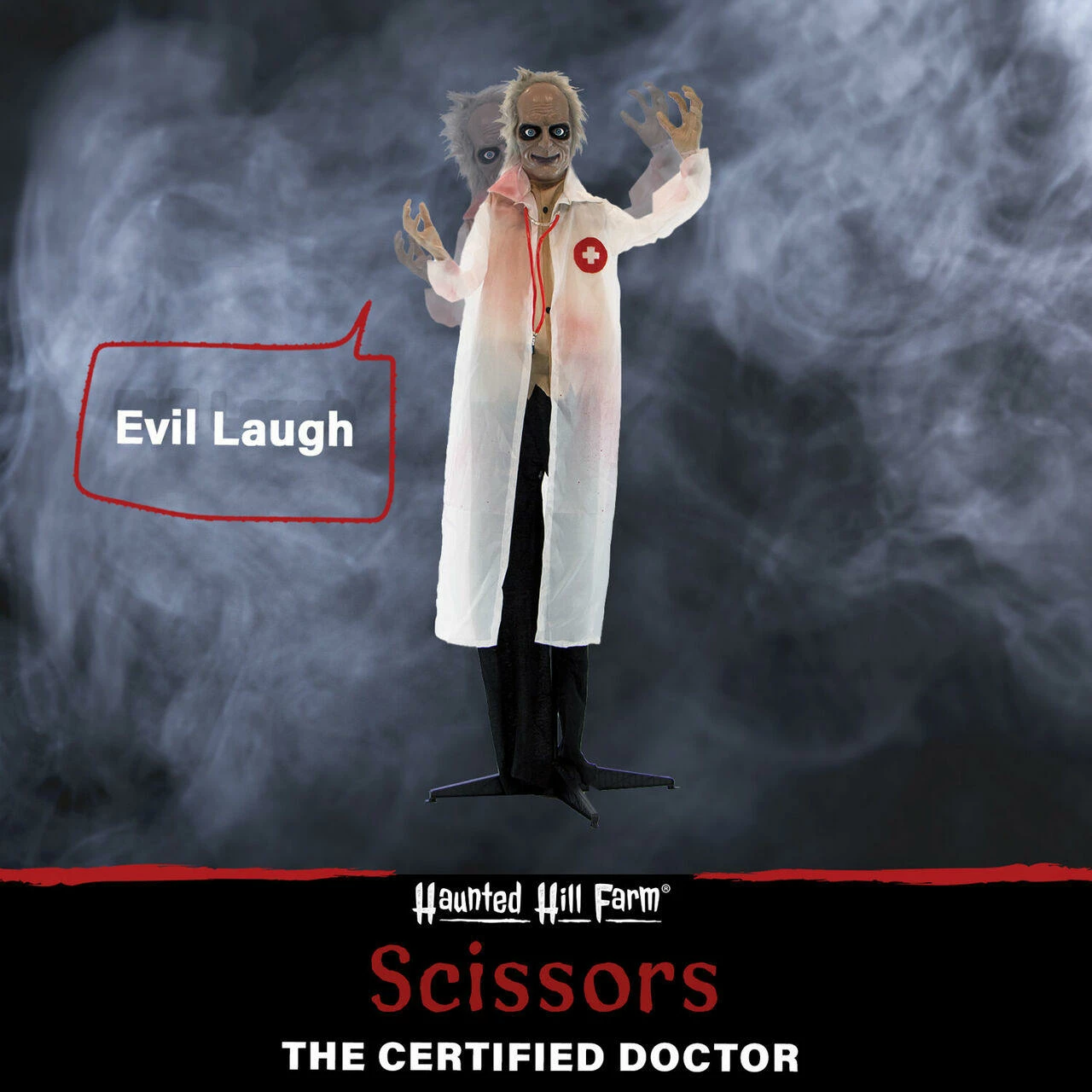 Beware of Doctor Scissors from Haunted Hill Farm’s Haunted Hospital Collection. Watch out, Doctor Scissors lost all of his certifications long ago, but this Halloween he gets to practice yet again. With his long lab coat covered in blood, you can tell Doctor Scissors is good at what he does… but you may not like it. His chilling smile leaves no room to question if Doctor Scissors is good or evil, even the bravest of brave will be petrified to cross his path. Doctor Scissors mocks and laughs with demonic incantations and his arms and head move to reach out and grab all those who surround him. His crazy, flashing red eyes will light up the night sky and entice your visitors to come closer, but be advised he is not afraid to leave a mark…