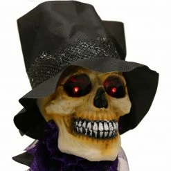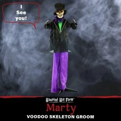 Be afraid! Be very afraid of Haunted Hill Farm’s Voodoo collection. These blood-curdling creatures are sure to terrify any trick-or-treaters, co-workers, or customers. Marty, the skeleton groom, looks dapper in his purple and black suit and top hat, but don’t let his fresh style distract you from his terrifying presence. You’ll catch his glowing red stare even from a distance, and his creepiness will leave you feeling his eyes on you long after you’re gone. If that wasn’t scary enough, his touch-activated voice comes alive with striking mystical sounds of lightning layered over the chilling threat of “I see you,” along with his horrifying laugh. Marty’s penetrating gaze will ensure that no matter where you run or try to hide, he still sees you.