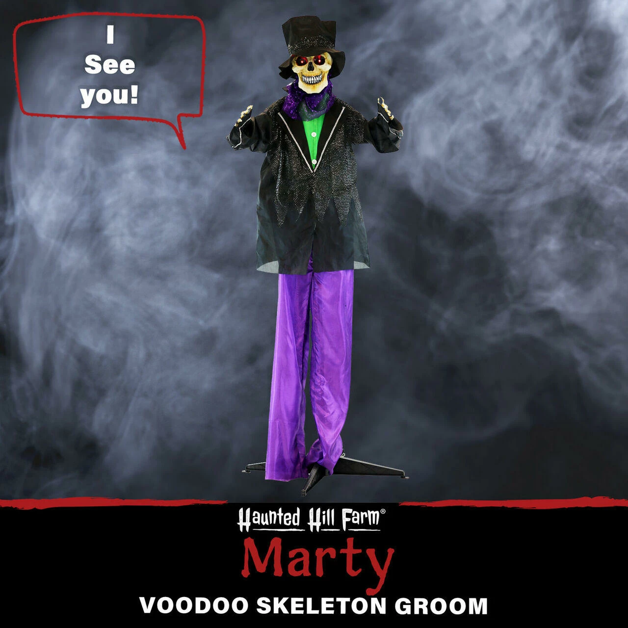 - Red LED lights illuminate Marty’s spooky eyes