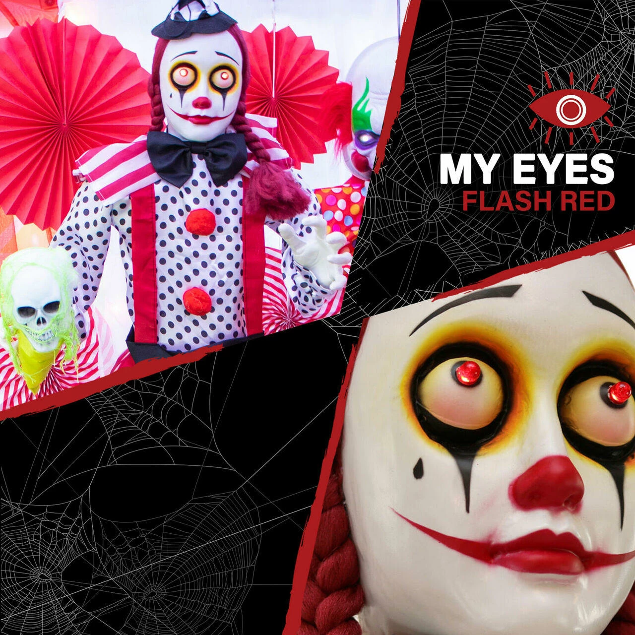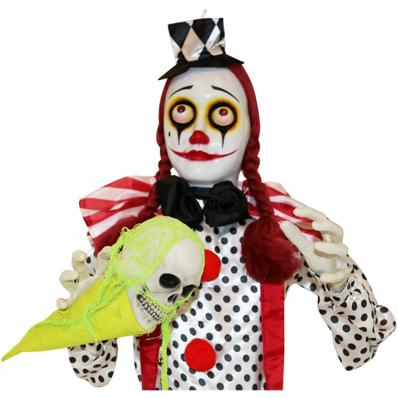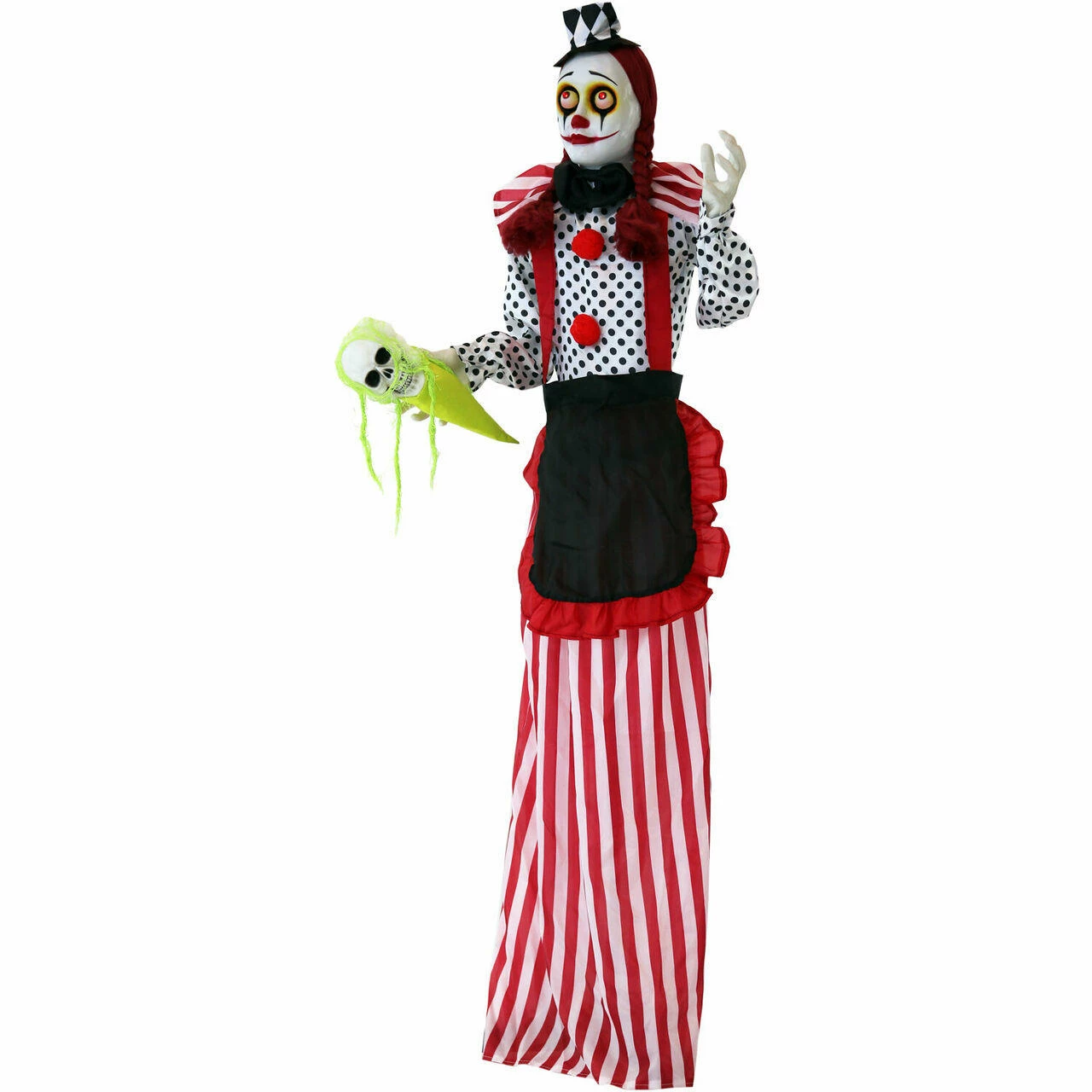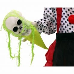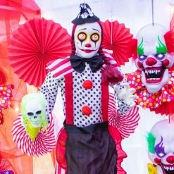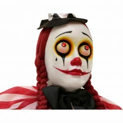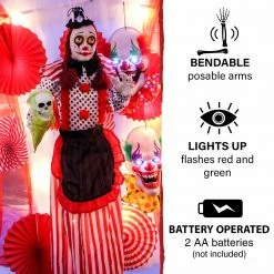 Be afraid. Be very afraid of Haunted Hill Farm’s Haunted Circus Collection. These blood curdling creatures are sure to terrify any trick-or-treaters, co-workers, or customers. Buffy the Clown may not say much, but she doesn’t need to. Visitors will shrink with fear when the lay eyes on this sinister, yet sad mime clown. Don’t be fooled by Buffy’s woeful expression. It’s all part of her show? Buffy’s eyes flash a fearsome red as she performs in the night. Dressed in a festive clown costume complete with polka dots, stripes, and a hat, one might mistake Buffy as friendly. That is, until they see the skull she clutches in her eerily human-like hands. Bend Buffy’s arms into a variety of frightening positions to keep the scares coming all night. She’s happy to stand at your doorstep or hang from your porch to terrify trick-or-treaters, party guests, and neighbors the entire Halloween holiday season.