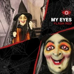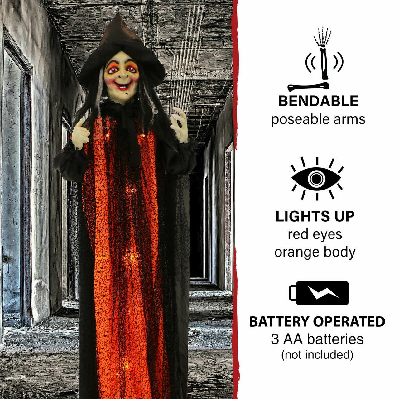 Be afraid. Be very afraid of Haunted Hill Farm’s Curses and Cauldrons Collection. These blood curdling creatures are sure to terrify any trick-or-treaters, co-workers, or customers. Greet visitors in a frighteningly festive way this Halloween. Place Scarlet the evil witch at your front window, porch, or in your haunted house stop visitors in their tracks. The horrifying hag’s eyes light up a sinister red while her orange dress is illuminated with light. She clutches a broom tightly in her grip; bend her arms into a variety of positions for scares that last the entire season. Dressed in a typical black witch hat and cape and sporting a red-lipped smile, pointed nose, long ratty hair, and a large mole on her chin, Scarlet will bewitch your guests with her terrifying looks alone. Invite her to your home this Halloween for the most startling, spirited holiday yet!