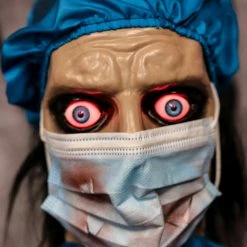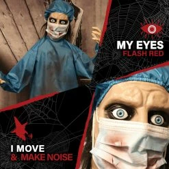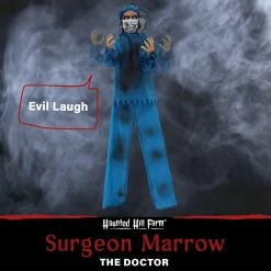 Beware of Surgeon Marrow from Haunted Hill Farm’s Haunted Hospital Collection. Watch out, Surgeon Marrow lost all of his certifications long ago, but this Halloween he gets to practice yet again. With his scrubs covered in blood, you can tell Surgeon Marrow is good at what he does… but you may not like it. His chilling smile leaves no room to question if Surgeon Marrow is good or evil, even the bravest of brave will be petrified to cross his path. Surgeon Marrow mocks and laughs with demonic incitation and his arms and head move to reach out and grab all those who surround him. His crazy, flashing red eyes will light up the night sky and entice your visitors to come closer, but be advised he is not afraid to leave a mark…