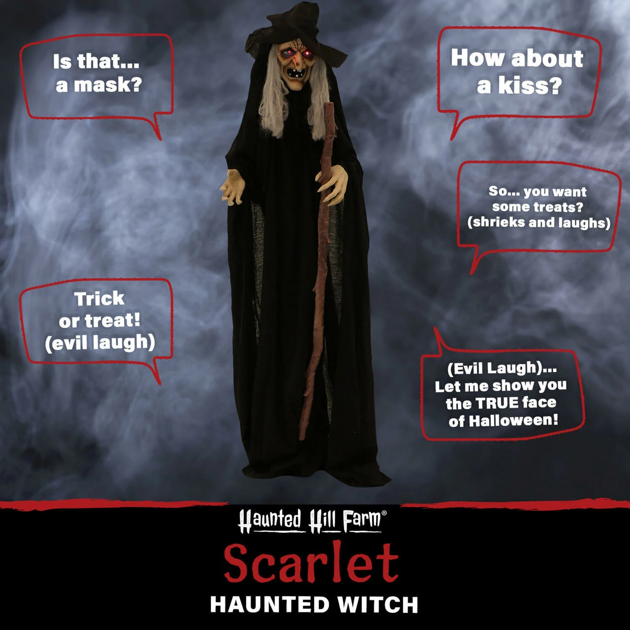 - Sinister witch voice greets guests with five chilling phrases