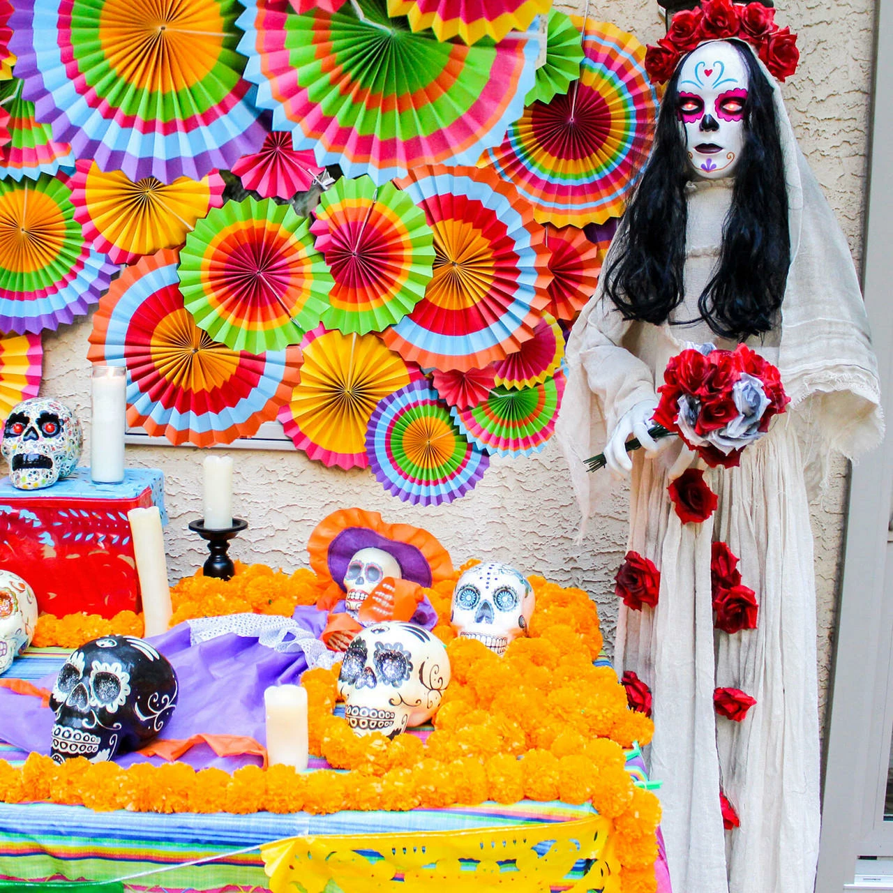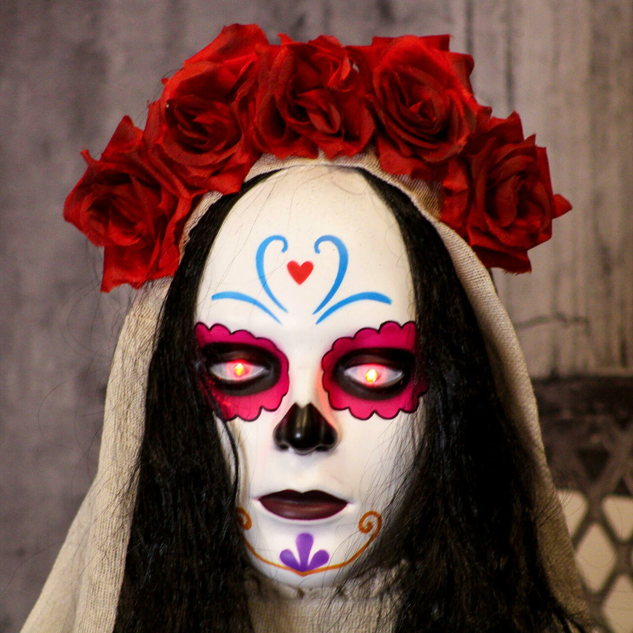 - 5.5-ft. sugar-skull inspired Day of the Dead decorative skeleton animatronic with flashing red eyes and sound