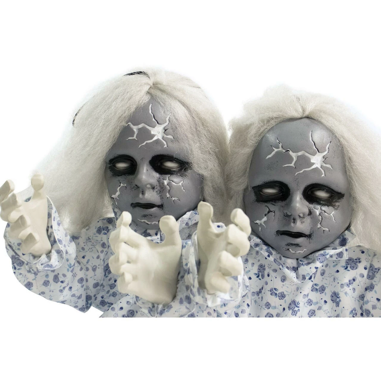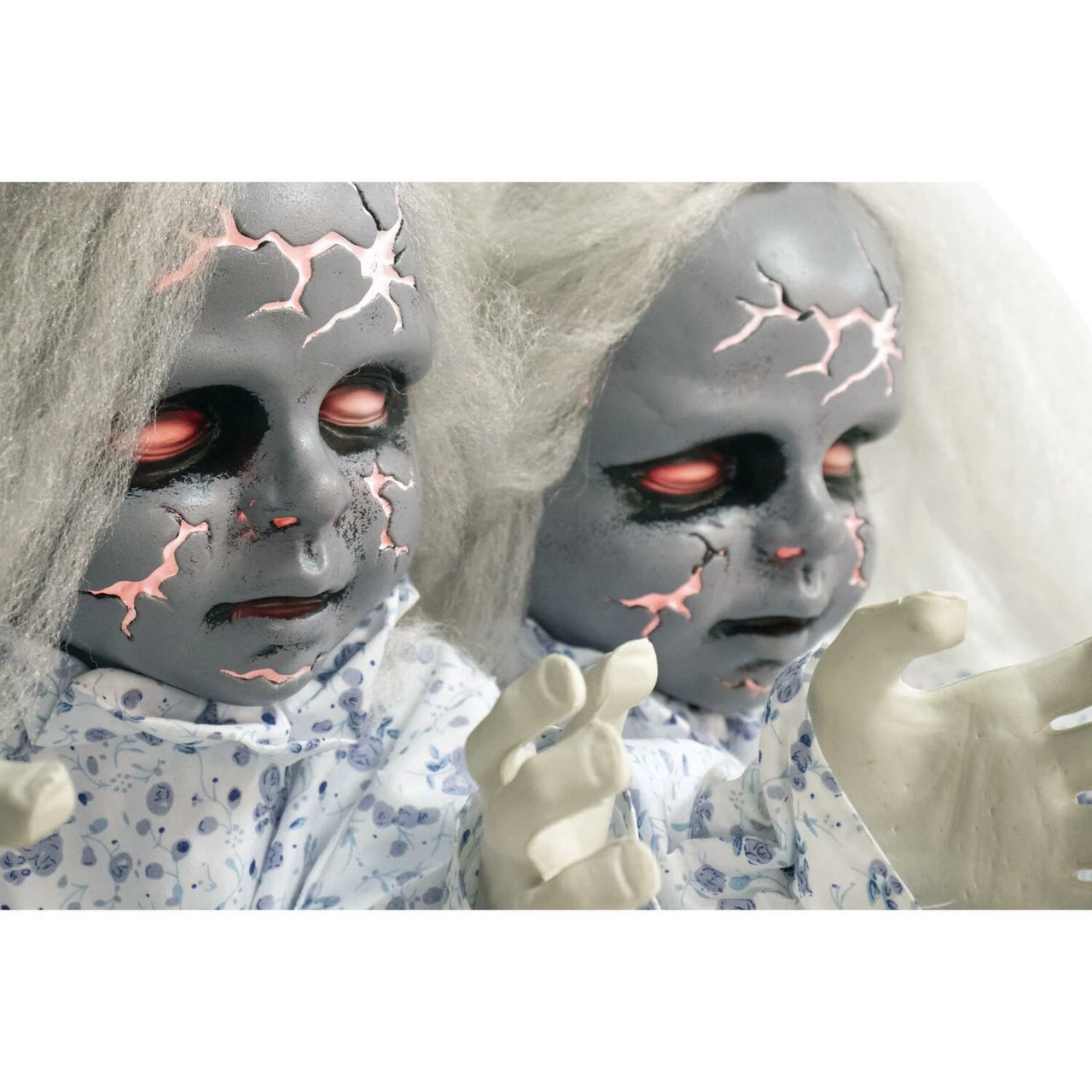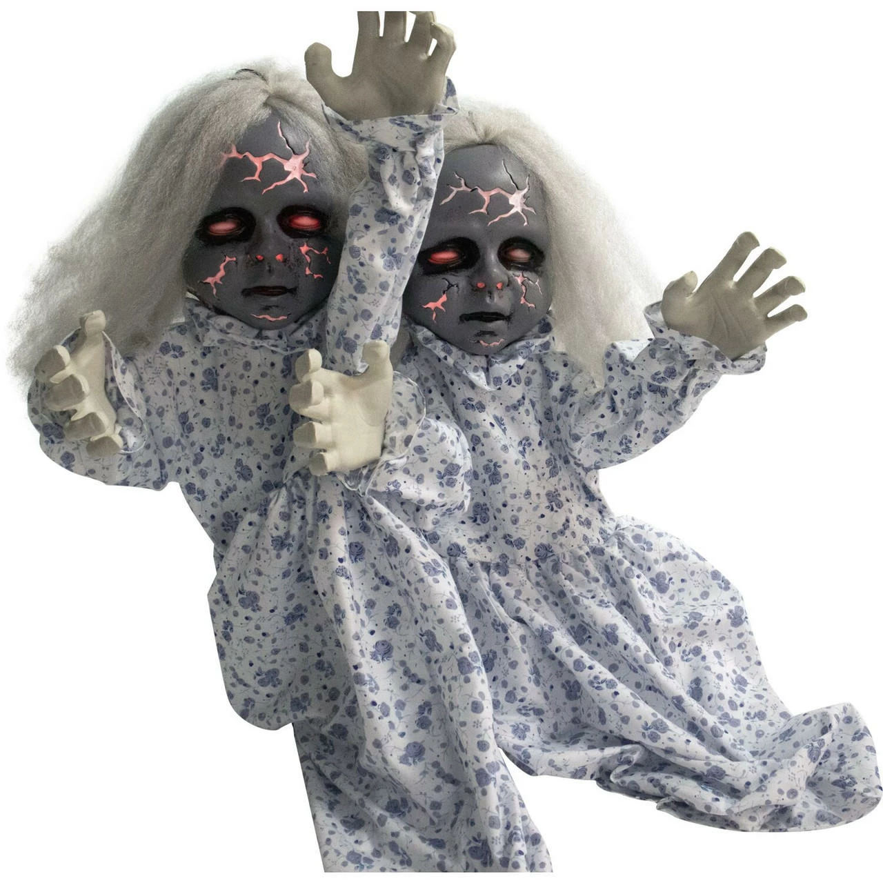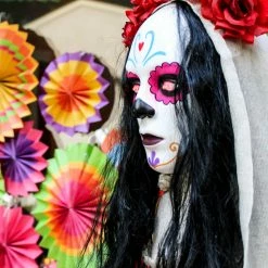 Celebrate and honor the exquisite holiday of Día de los Muertos with this intricate, sugar-skull inspired, animatronic bride from Haunted Hill Farm. Carolina is the perfect final addition to any Day of the Dead or Halloween decorations. Her vibrant and eye-catching colors of black, blue, and red contrast perfectly with the solid white of her skull. Carolina is touch activated and her eyes flash a brilliant red while she speaks. Her bendable arms allow for her to be placed in many positions and she comes with a convenient hanging loop. Her lightweight and compact features allow for her to be placed next to your altar, decorations, or candy dish. Honor this beautiful celebration with a sugar-skull inspired animatronic bride from Haunted Hill Farm.