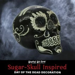 Celebrate and honor the exquisite holiday of Día de los Muertos with this intricate, sugar-skull inspired, decoration from Haunted Hill Farm. This ornate piece can be the perfect final addition to any Day of the Dead or Halloween decorations. The gold accents compliment the black skull perfectly. The lightweight and compact features allow for the skull to be placed on a counter, altar, next to the candy dish, or anyplace you find suitable. Honor this beautiful celebration with a sugar skull from Haunted Hill Farm.