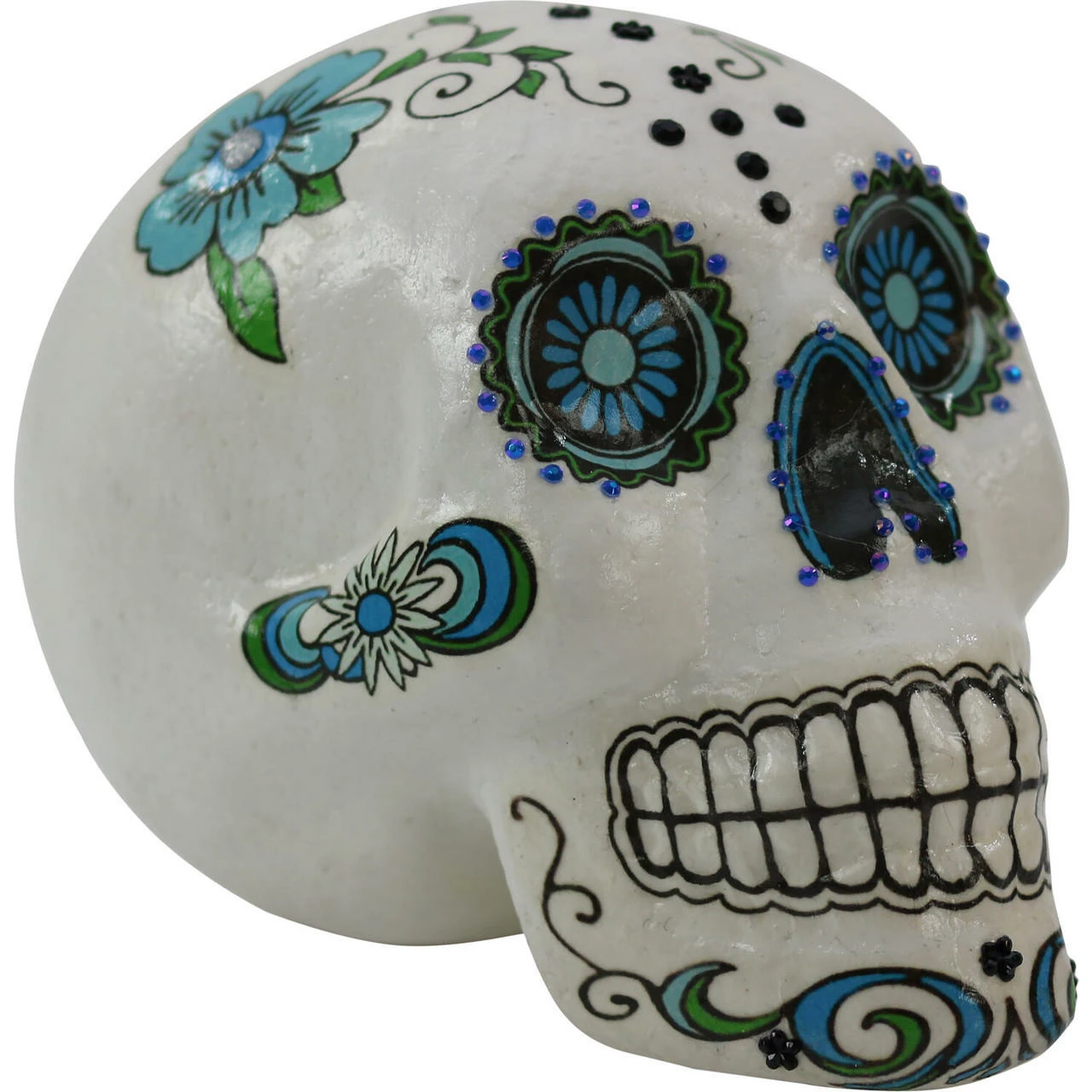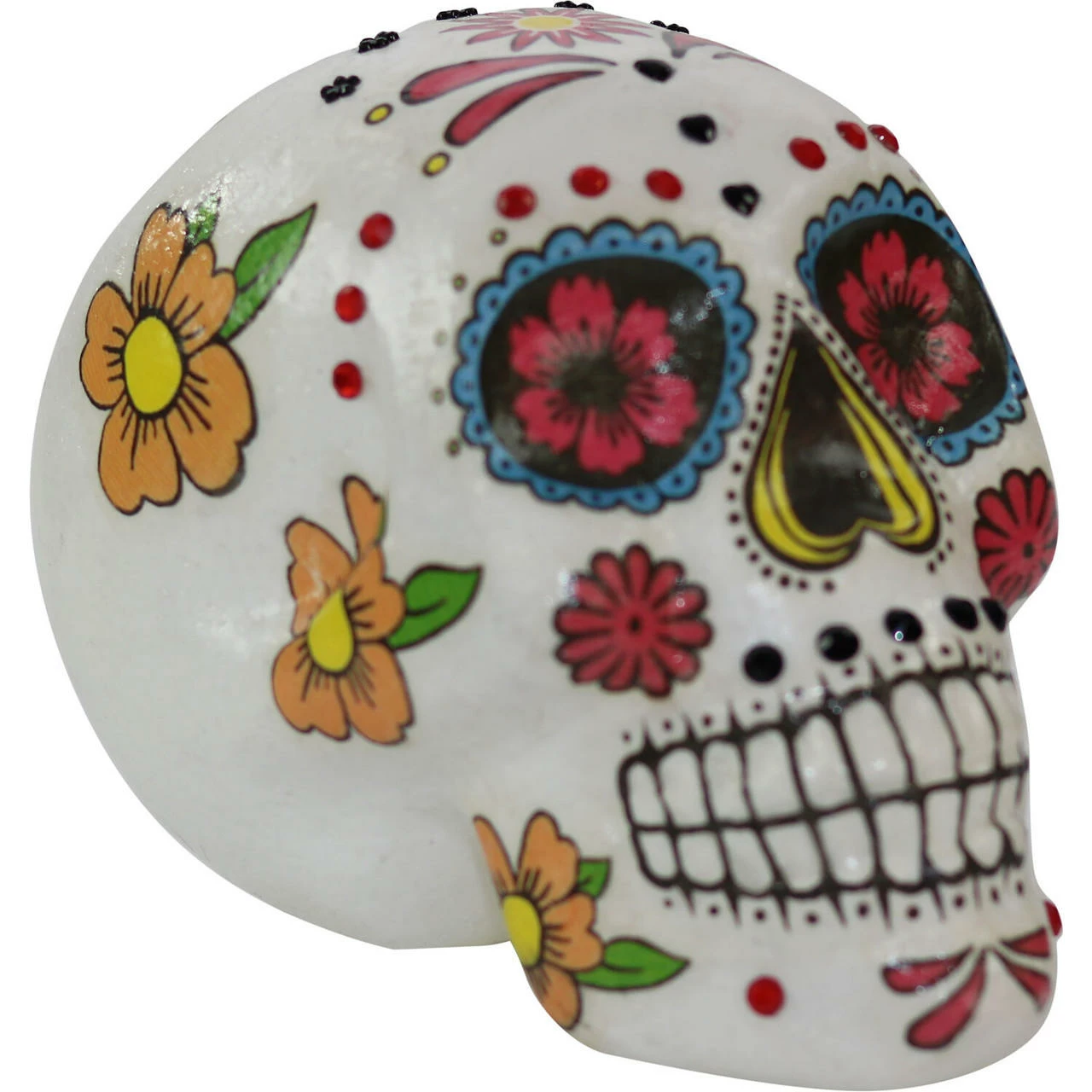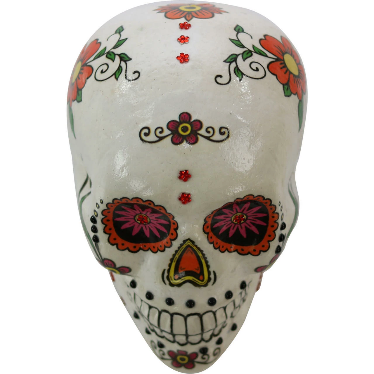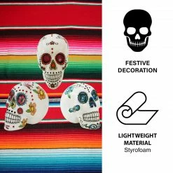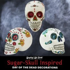 Celebrate and honor the exquisite holiday of D?a de Los Muertos with this intricate, sugar-skull inspired, decorations from Haunted Hill Farm. These ornate pieces can be the perfect final additions to any Day of the Dead or Halloween decorations. The vibrant and eye-catching colors of each skull contrast perfectly with the solid off-white of the skull. The lightweight and compact features allow for the skulls to be placed on a counter, altar, next to the candy dish, or any place you find suitable. Honor this beautiful celebration with a sugar skulls from Haunted Hill Farm.