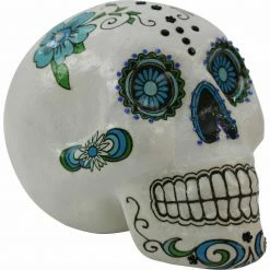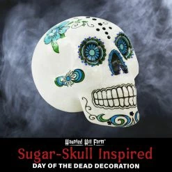 Celebrate and honor the exquisite holiday of Día de los Muertos with this intricate, sugar-skull inspired, decoration from Haunted Hill Farm. This ornate piece can be the perfect final addition to any Day of the Dead or Halloween decorations. The accents of blue and black compliment the off-white of the skull perfectly. The lightweight and compact features allow for the skull to be placed on a counter, altar, next to the candy dish, or anyplace you find suitable. Honor this beautiful celebration with a sugar skull from Haunted Hill Farm.