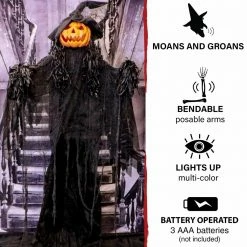 Be afraid. Be very afraid of Haunted Hill Farm’s haunted cornfield collection. These blood curdling creatures are sure to terrify any trick-or-treaters, co-workers, or customers. Gourdy the pumpkin has a witchy appearance with a long, wispy black robe and black pointed hat. His pumpkin head is carved into a spooky grin and illuminates with multicolored lights when activated. Unsettling moans and ominous noises start up unexpectedly when Gourdy comes alive to scare the neighborhood. Add him to your spooky season arrangement and brace yourself for the horror.