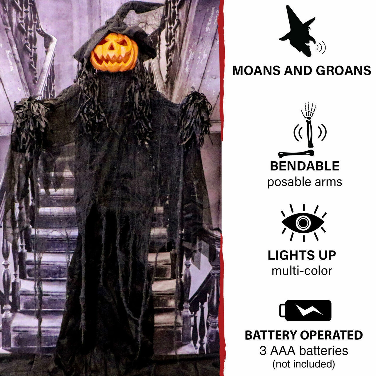 - Gourdy is touch activated – Sounds include unsettling moans and ominous noises