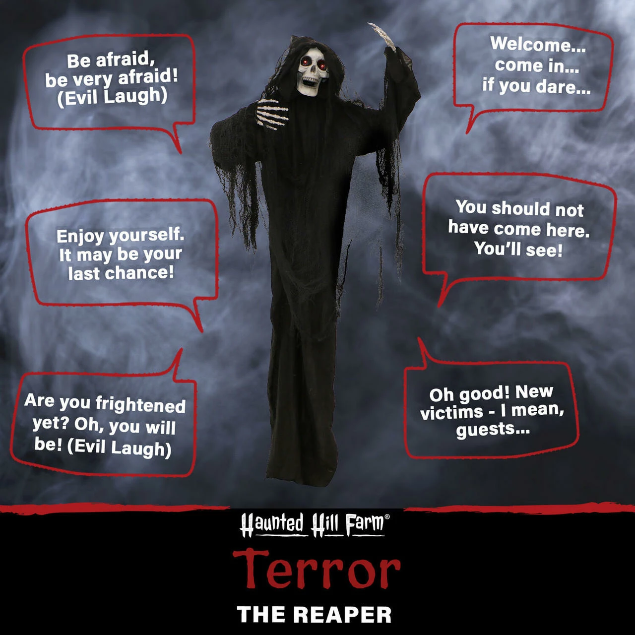 Be afraid. Be very afraid of Haunted Hill Farm’s Reaper Collection. These blood curdling creatures are sure to terrify any trick-or-treaters, co-workers, or customers. Terror the Reaper got his name for a reason. Any who are unfortunate enough to cross this soul-hunting horror are sure to flee in fear. Terror’s mouth moves as he greets victims with ominous warnings- “Enjoy yourself,? he says, “It may be your last chance.? As Terror laughs in wicked delight, his eyes flash red and stormy sounds fill the air around him. Stand Terror at your door or hang him over your treats to ensure only the bravest of visitors stop by. He’ll welcome them to come on in, that is, if they dare..