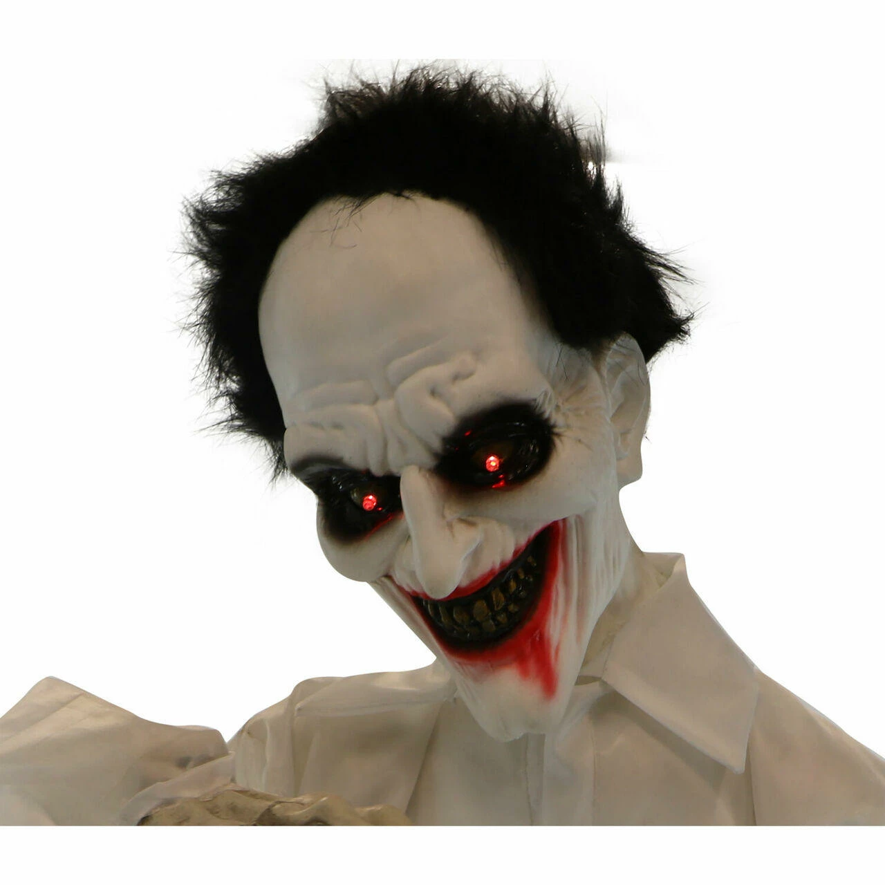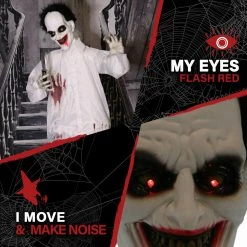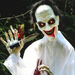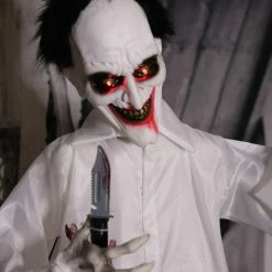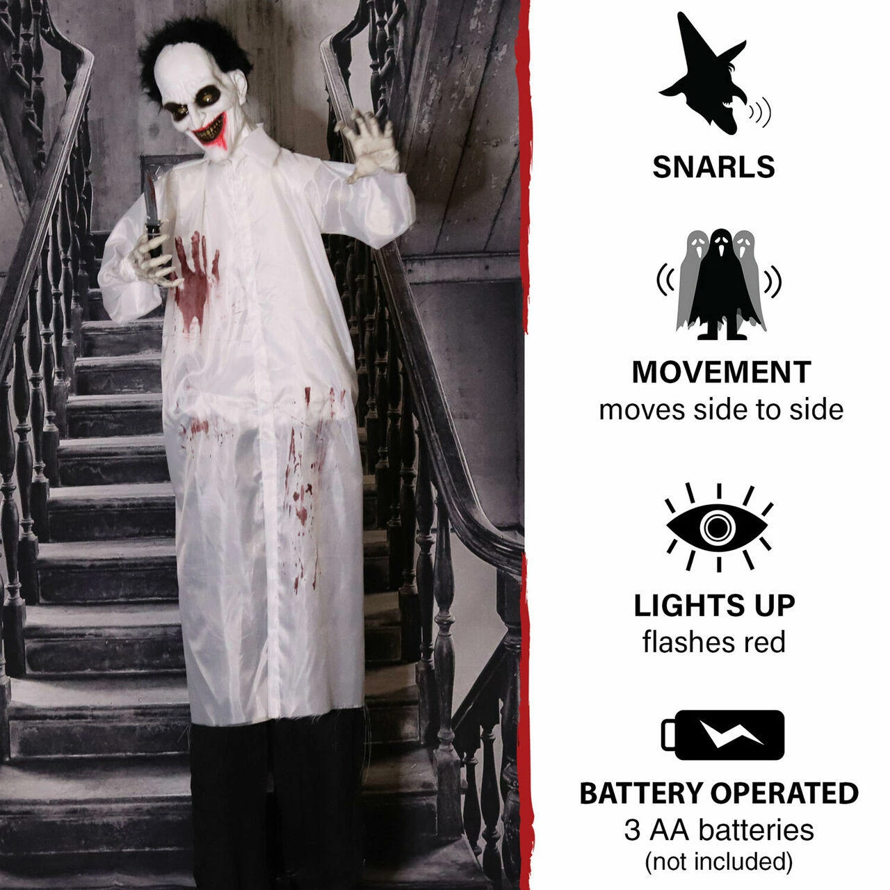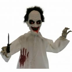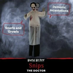 Beware of Snips from Haunted Hill Farm’s Haunted Hospital Collection. Watch out, Snips lost all of his certifications long ago, but this Halloween he gets to practice yet again. With his long lab coat covered in blood, you can tell Snips is good at what he does… but you may not like it. His chilling smile leaves no room to question if Snips is good or evil, even the bravest of brave will be petrified to cross his path. Snips snarls and growls with demonic incantations and his arms and head move to reach out and grab all those who surround him. His crazy, flashing red eyes will light up the night sky and entice your visitors to come closer, but be advised he is not afraid to leave a mark…