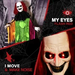 - Animatronic can stand or hang to fit eerily into your Halloween decorations