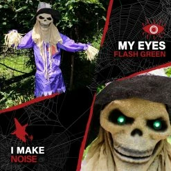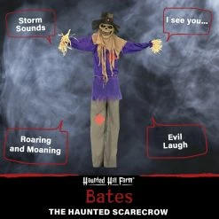Be afraid. Be very afraid of Haunted Hill Farm’s Haunted Cornfield Collection. These blood curdling creatures are sure to terrify any trick-or-treaters, co-workers, or customers. Bates the Haunted Scarecrow is far too eager to guard your home this Halloween. The terrifying half-straw, half-man monster cackles evilly as he warns guests, “I see you.? Adjust his bendable arms to point directly at visitors? Bates emits thunder claps and wind gusts into the night as his eyes flash a gruesome green. He can be suspended by his included hanging loop or perched on his stand next to your holiday treats. Don’t be fooled by Bates’ human-like attire. There isn’t a shred of decency in the horrific hay man.
