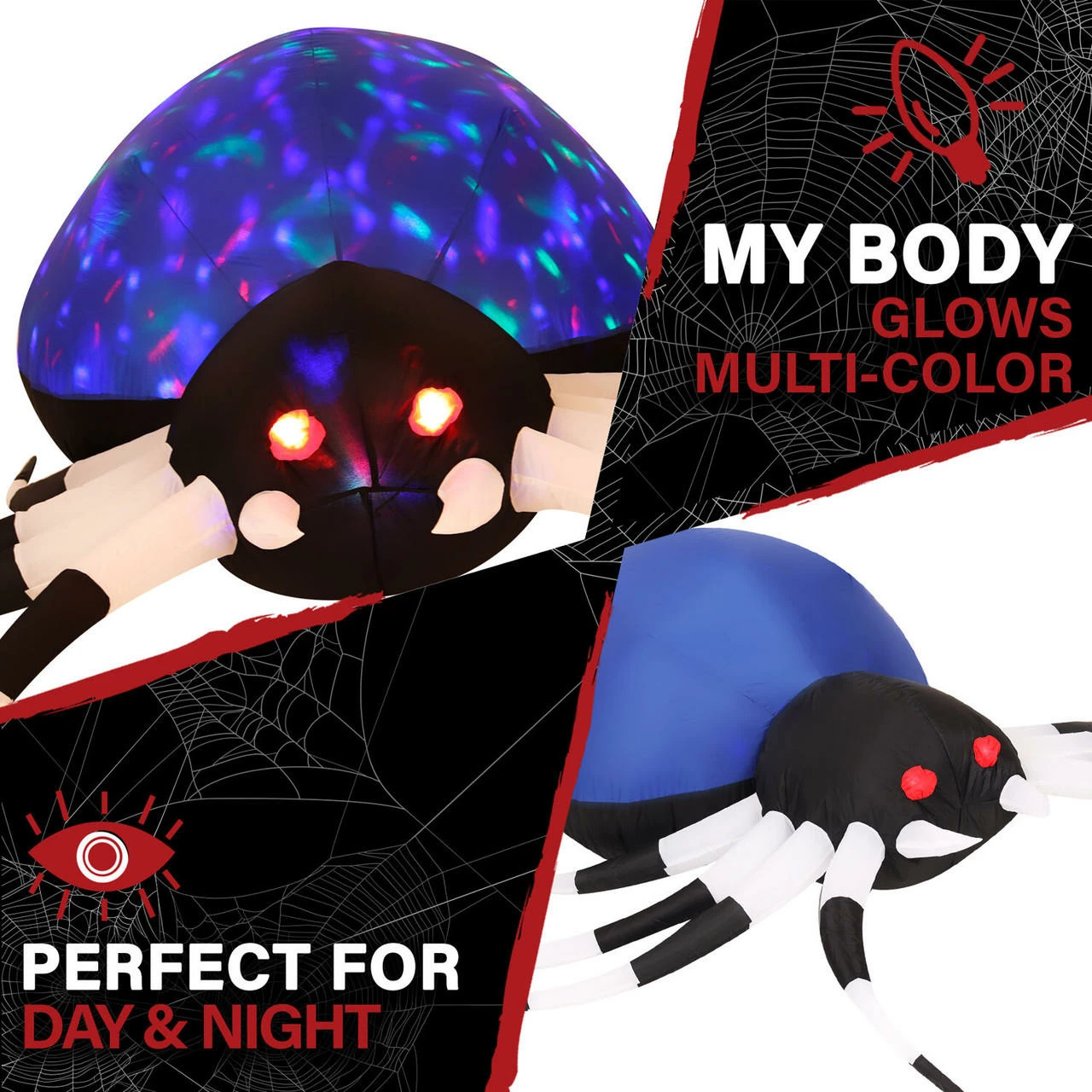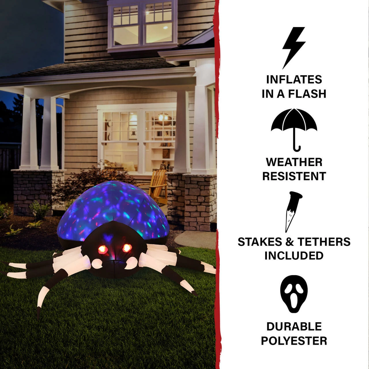 Your neighbors will be in for a fright when they see your 5.9-ft. wide Inflatable Blue Spider with Multi-Color Disco Lights. This pre-lit inflatable is outfitted with 3 total internal white and multi-color disco lights and will be the centerpiece of your own personal haunted house. It’s big enough to make the neighbors notice but still works in smaller yards or walkways. It’s the perfect trick to give your trick-or-treaters a scare without giving them nightmares. The treat is how quick and easy it is to set up with included ropes and lawn stakes for secure installation. Thanks to the internal lights and fan, all you need to do is unpack it, plug it in, stake it down, and you’re ready for some scary fun all Fall long. Created out of durable, weather-resistant polyester, you won’t need to worry about holes. Your inflatable will last year after year and scare after scare. With Haunted Hill Farm, you’ll be the scariest house on the block!