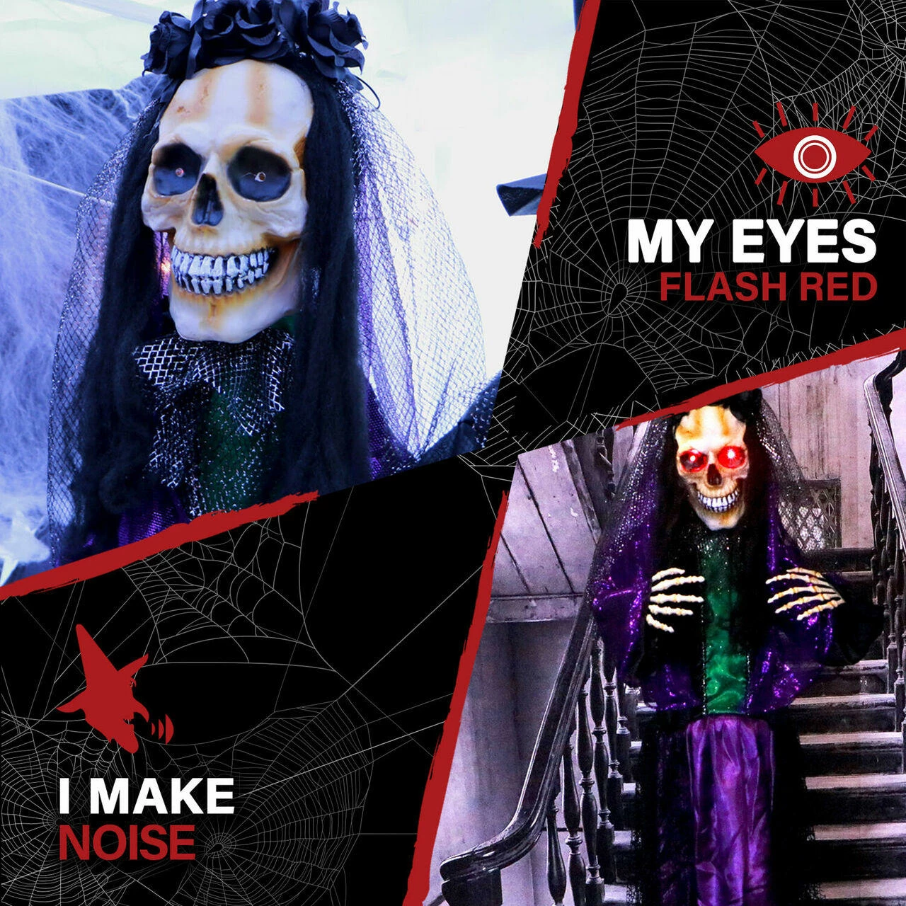 - Animatronic can stand or hang to fit eerily into your Halloween decorations