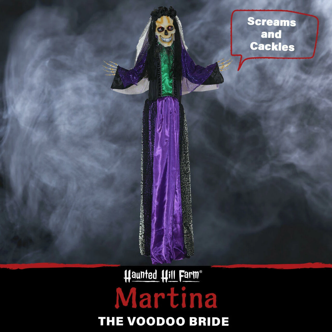 Be afraid! Be very afraid of Haunted Hill Farm’s Voodoo collection. These blood-curdling creatures are sure to terrify any trick-or-treaters, co-workers, or customers. Martina, the Voodoo Bride, is not afraid of her magic? but you should be! Her glowing red eyes are sure to scare the bravest of brave and will leave you feeling her presence on with long after you’re gone. If that wasn’t scary enough, her touch-activated voice comes alive with striking mystical sounds of lightning layered over the chilling cackles along with her horrifying laugh. Martina’s penetrating gaze will ensure that no matter where you run or try to hide, she still sees you.