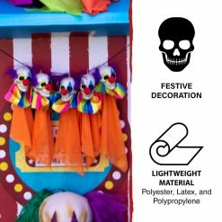 Be afraid! Be very afraid of the Haunted Circus Collection by Haunted Hill Farm. These blood-curdling decorations are sure to terrify any trick-or-treaters, co-workers, or customers. For an extra scary flair, hang this Clow garland from your porch, at your doorway, or outside your haunted house. These six hanging clowns dressed in orange, ghost-like dresses are sporting blue and yellow face paint that will send shivers down your block. Their skeleton-like heads are frozen in sinister toothy smiles, but visitors won’t be smiling when they see them. Hang this Clow garland at your home for the most fearsome, festive Halloween yet.