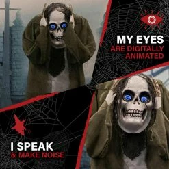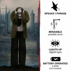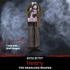 Be afraid! Be very afraid of the Reaper Collection from Haunted Hill Farm. Our blood-curdling reapers are just what you need to turn your home into the scariest house on the block. Henry, the headless reaper, used to be a feared horseman who would terrify those who crossed his path, but his head was severed in battle. Now he enjoys taking it off and putting it back on at his leisure, giving his spectators the creeps. Bump activated, Henry speaks one phrase with evil laughter and a thunderous sound effect. His digital eyes light up blue with creepy animations of them moving, blinking, and dilating. He is battery operated with posable arms and comes with a stand. Bring Henry home with you this Halloween to greet your trick-or-treaters with a scare that will surely give them nightmares.