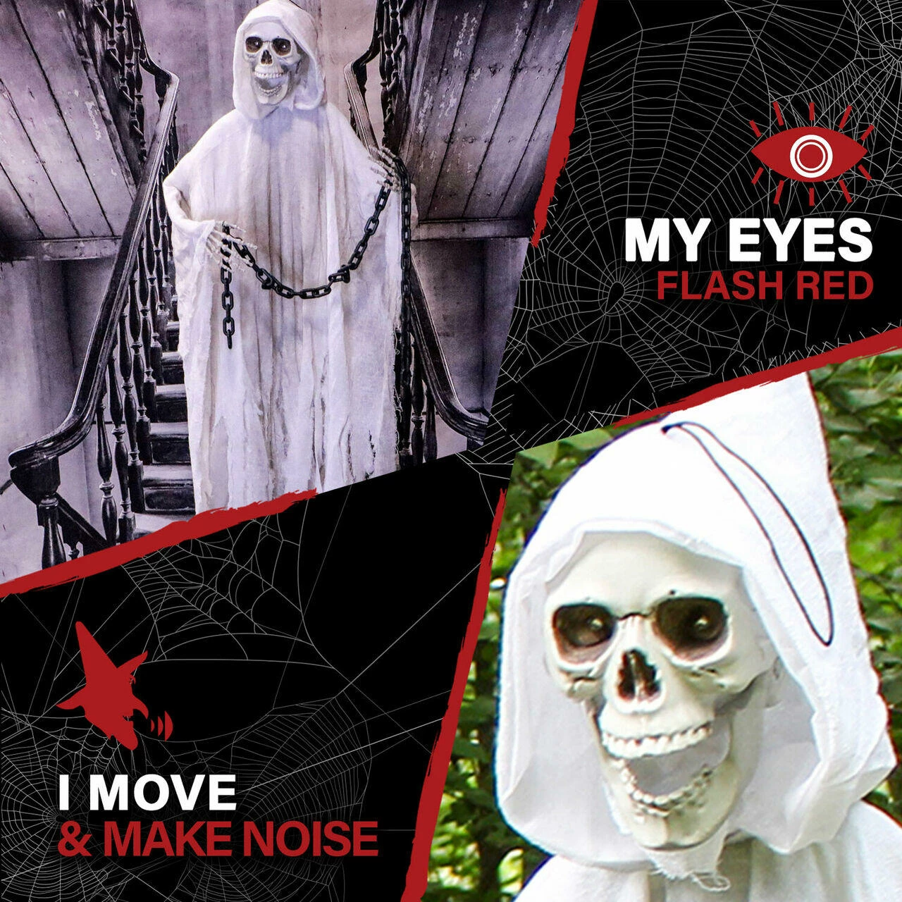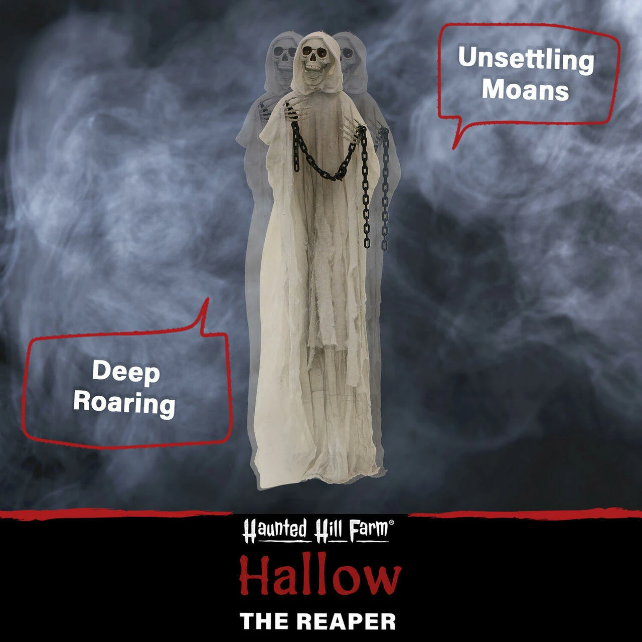 Be afraid. Be very afraid of Haunted Hill Farm’s of Reaper Collection. These blood curdling creatures are sure to terrify any trick-or-treaters, co-workers, or customers. Invite Hallow to your home for a truly undead Halloween. Place the 6.25-ft reaper’s skeleton body on your porch, door-step, or above your bowl of treats to terrify any who dare approach. When visitors get to close, his eyes flash a fearsome red as he releases terrifying roars. Hallow clutches a chain in his ghostly skeleton hands, determined to trap unsuspecting guests. Only the boldest of trick-or-treaters will brave the gruesome ghoul’s sinister smile, monstrous moans, and rocking life-like body. Be warned. Hallow comes hungry, but not for candy