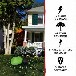 Your neighbors will be in for a fright when they see your 6.5-Ft. Inflatable Black and Green Spider . This pre-lit inflatable is outfitted with two internal white LED lights and will be the centerpiece of your own personal haunted house. It’s big enough to make the neighbors notice but still works in smaller yards or walkways. It’s the perfect trick to give your trick-or-treaters a scare without giving them nightmares. The treat is how quick and easy it is to set up with included ropes and lawn stakes for secure installation. Thanks to the internal lights and fan all you need to do is unpack it, plug it in, stake it down and you’re ready for some scary fun all Fall long. Created out of durable, weather resistant polyester, you won’t need to worry about holes. Your inflatable will last year after year and scare after scare. With Haunted Hill Farm, you’ll be the scariest house on the block!