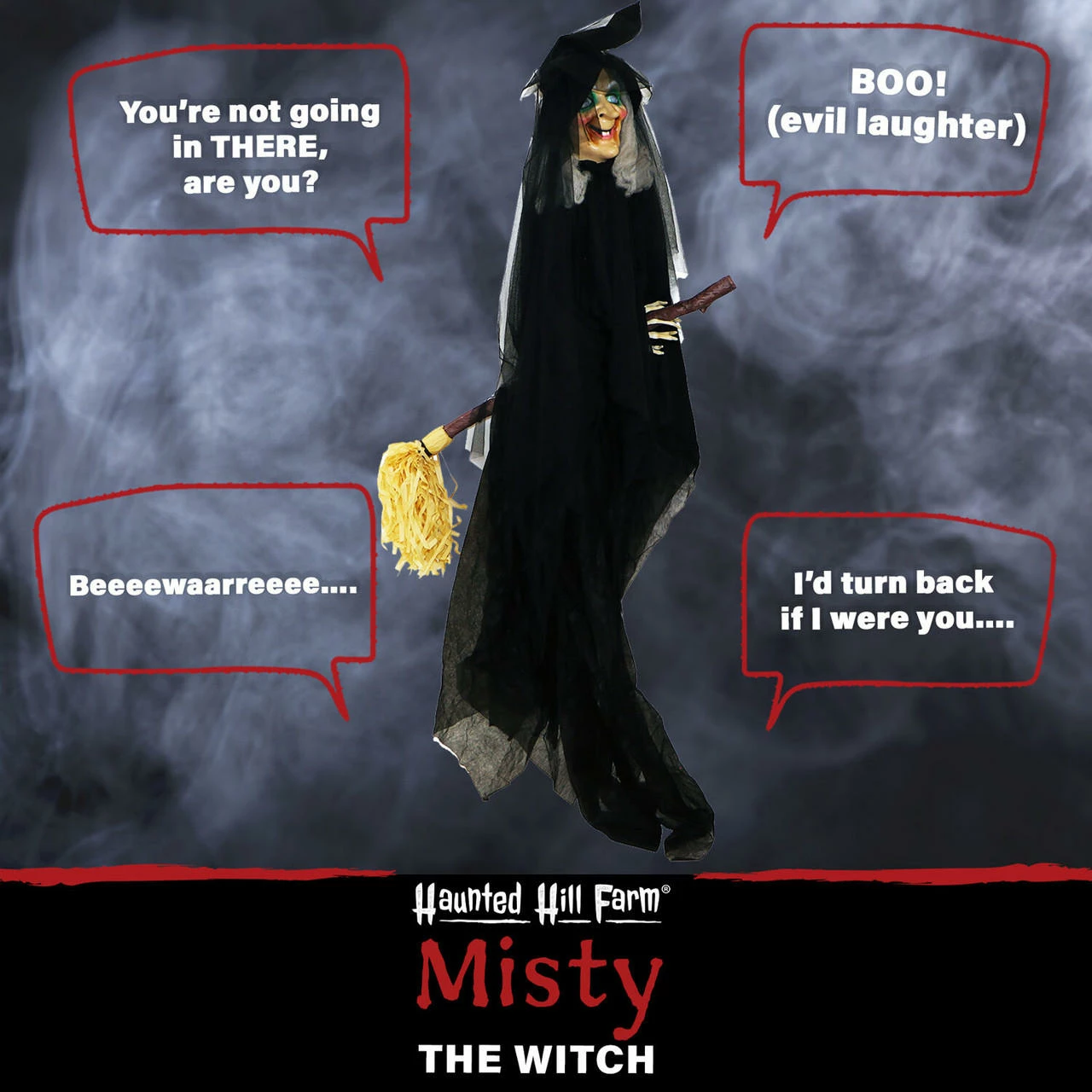 Be afraid. Be very afraid of Haunted Hill Farm’s Curses and Cauldrons Collection. These blood curdling creatures are sure to terrify any trick-or-treaters, co-workers, or customers. Rain, sun, fog, or hail, Misty the Witch rides her broom for screams. This horrifying hag’s eyes flash red as she cackles evilly, searching for victims in the night. “BOO, “she’ll shriek at visitors, hoping for fresh fear. If guests dare approach her, they’re sent running when they hear Misty’s ominous warnings, see her evil smile, and gaze into her cold blue eyes. Her head moves in wicked delight as she watches trick-or-treaters flee. Suspend Misty from your porch or doorway or set her next to your holiday treats to keep the scares coming all season long.