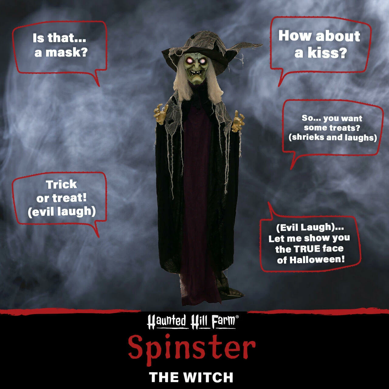 Be afraid. Be very afraid of Haunted Hill Farm’s Curses and Cauldrons Collection. These blood curdling creatures are sure to terrify any trick-or-treaters, co-workers, or customers. Spinster the Witch is eager to greet your guests this Halloween. She laughs wickedly as she taunts each passerby, her eyes flashing a fearsome red while she shrieks. “Let me show you the true face of Halloween, she croons. I wouldn’t let her This horrifying hag wears a cloak, a pointed witch hat, and tattered white rags. Spinster’s red eyes, mouth lacking several teeth, and gnarled skin will make her stand out from your porch, at your doorstep, or in your walkway. If you invite the lonely, yet dreadful, witch to your home this holiday, she promises a bewitched Halloween. Spinster doesn’t promise to be nice, though