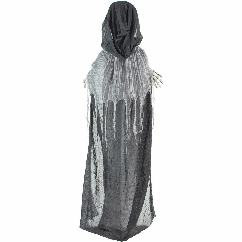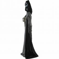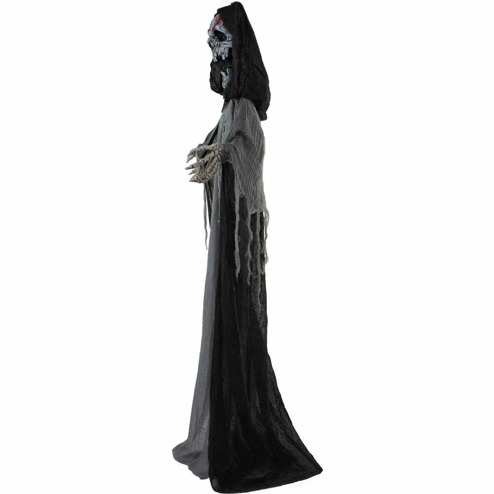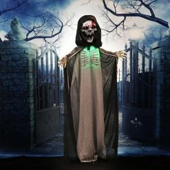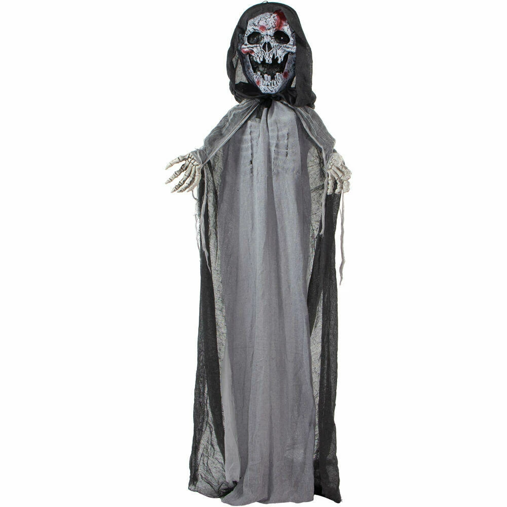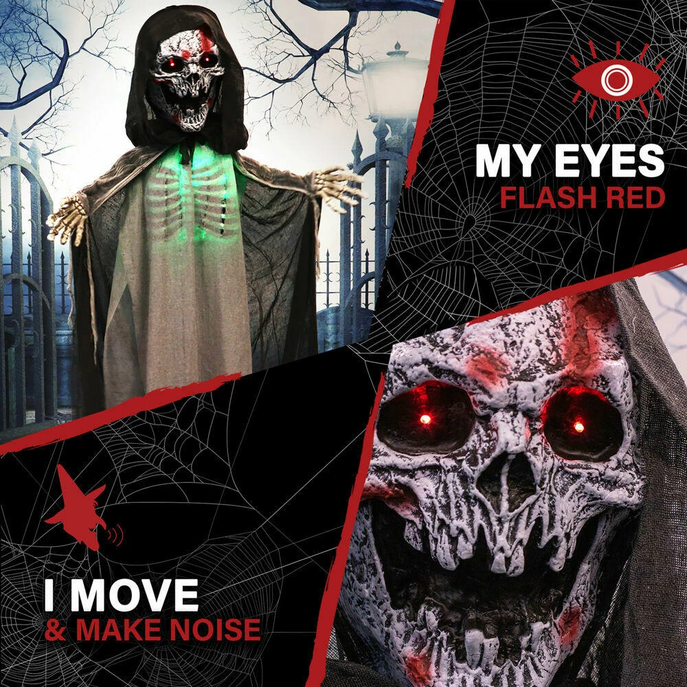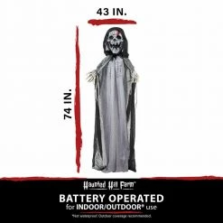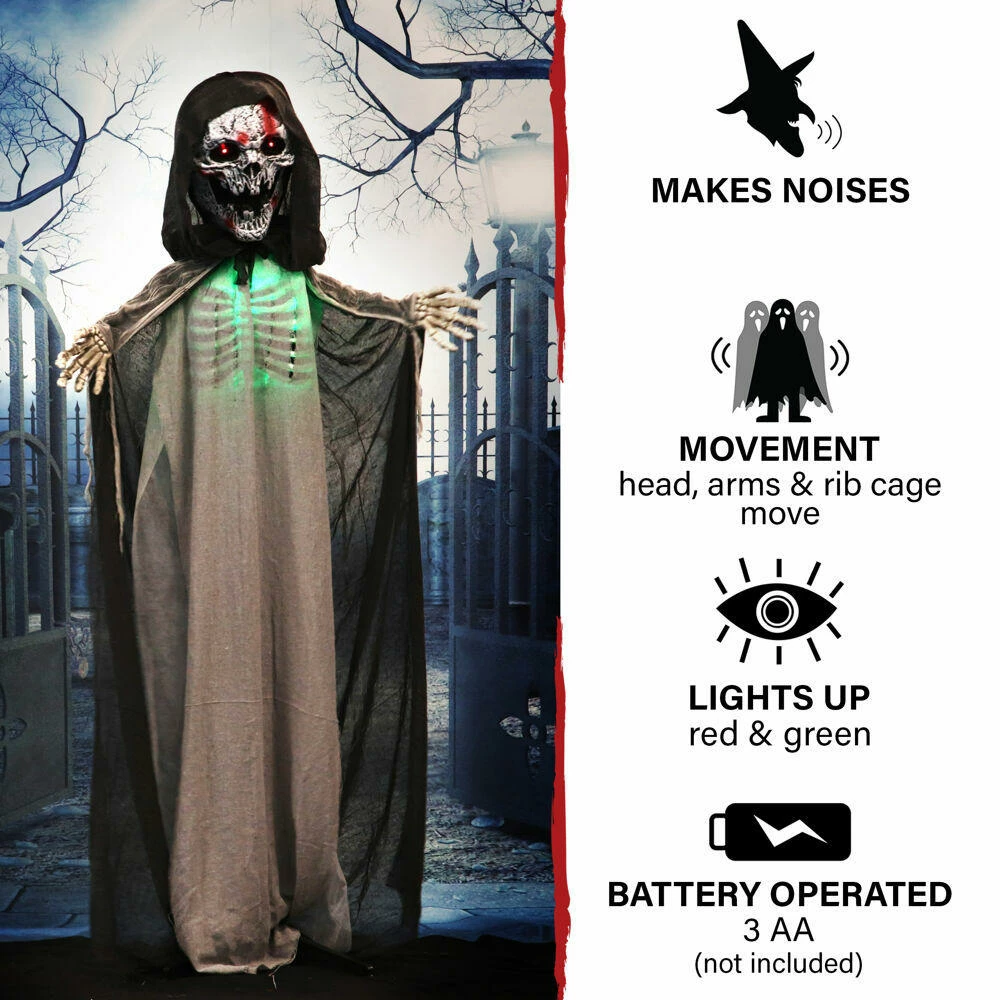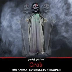 Be afraid! Be very afraid of the Reaper Collection from Haunted Hill Farm. Our blood-curdling reapers are just what you need to turn your home into the scariest house on the block. Crab, the evil skeleton reaper, is terribly mean, even amongst his fellow death bringers. He is often perceived to be the cruelest of them all, tormenting his victims before taking their souls. Bump activated, Crab features animated head, arm, and rib cage movements while moaning and groaning. He also has flickering red eyes and flashing green lights inside his chest, making him extra spooky at night. Battery operated with posable arms, your creature includes a stand and an optional hanging loop at the top of his head so you can display him however you want. Bring Crab home with you this Halloween to greet your trick-or-treaters with a scare that will surely give them nightmares.