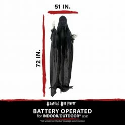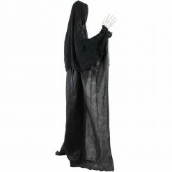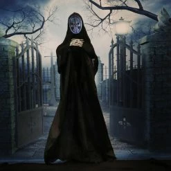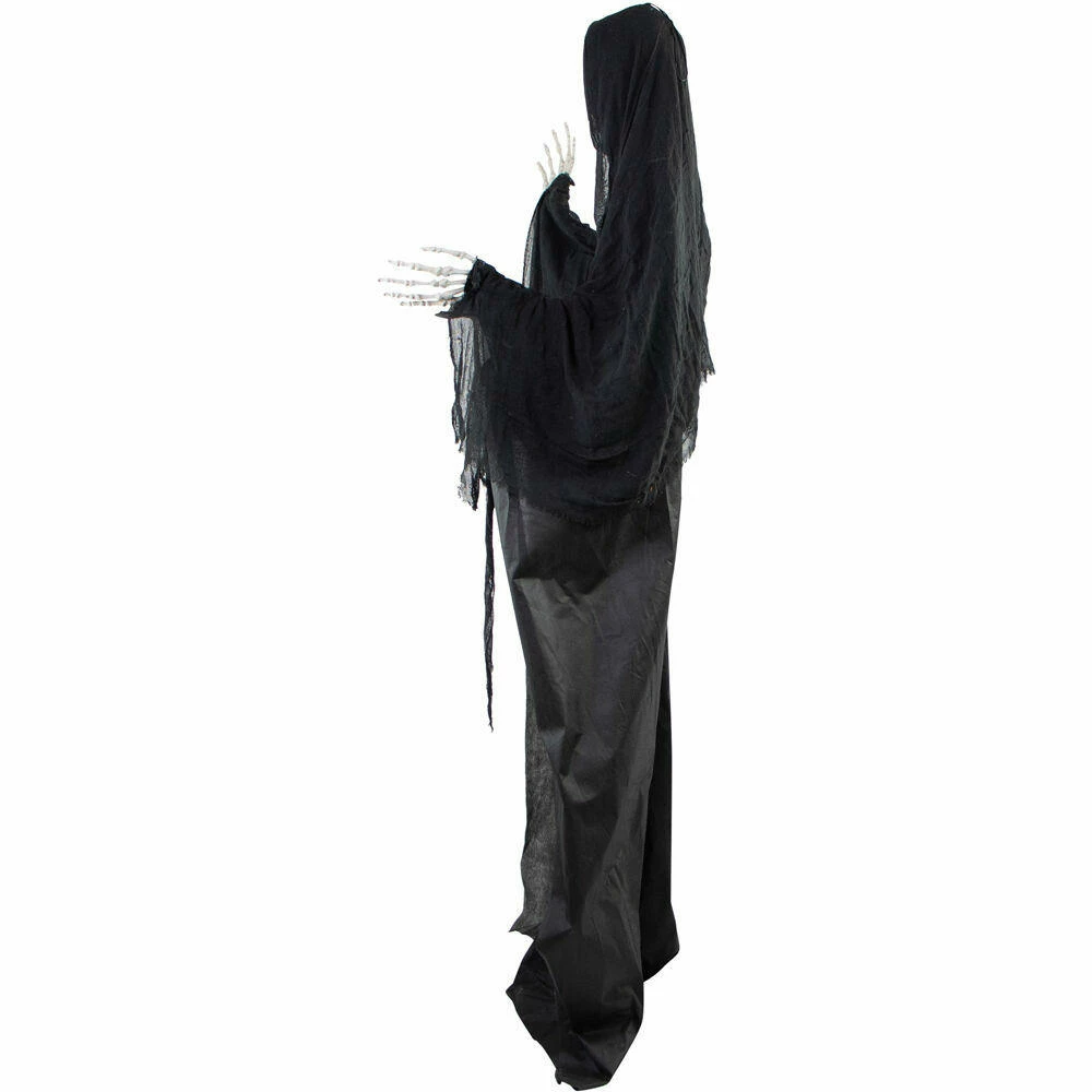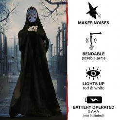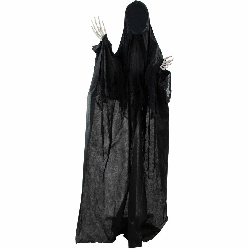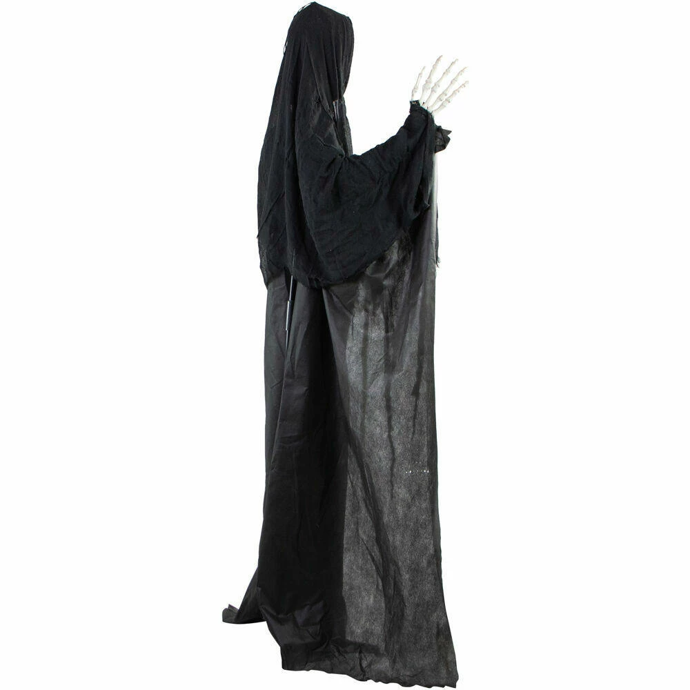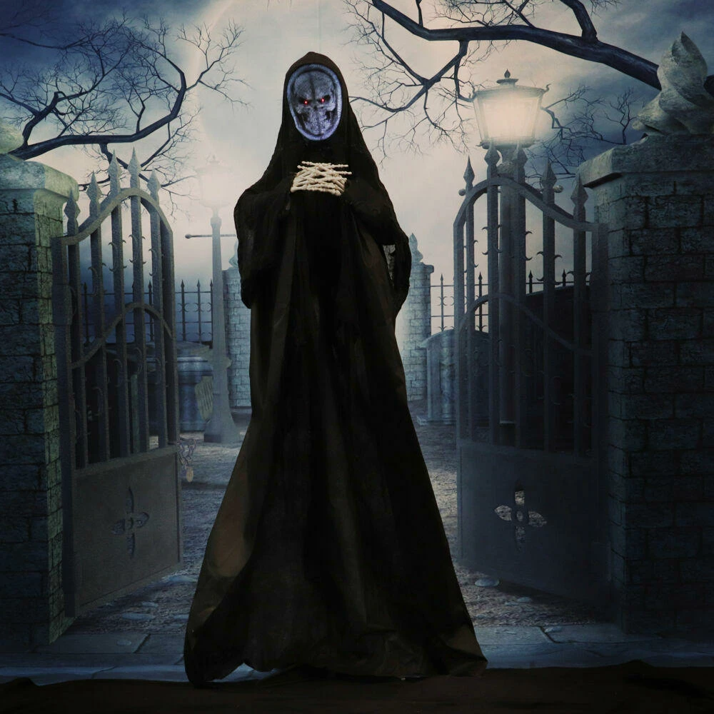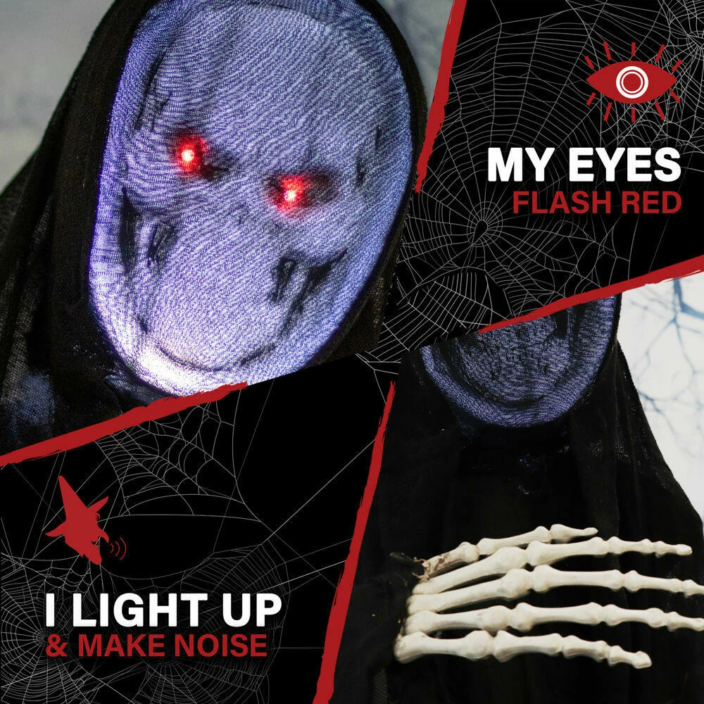 - Bump-activated creature has a skeleton face with red flashing eyes hidden under a black hood that is illuminated by a white light