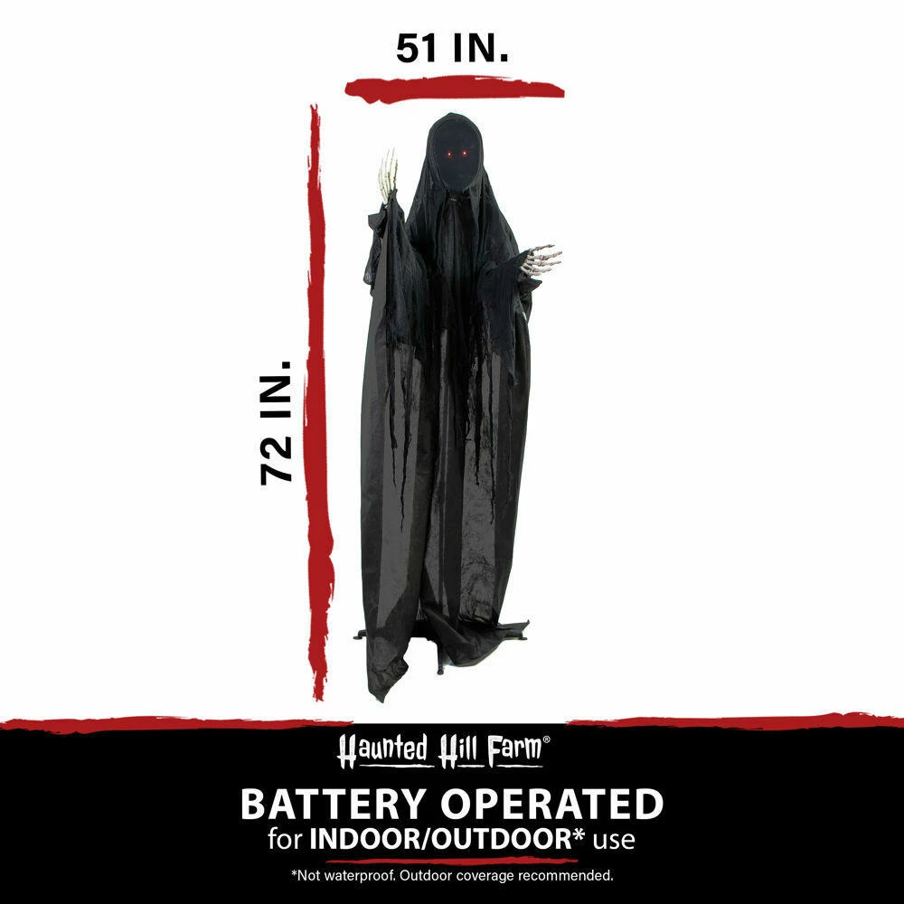 Be afraid! Be very afraid of the Reaper Collection from Haunted Hill Farm. Our blood-curdling reapers are just what you need to turn your home into the scariest house on the block. Dearmad, the ghostly reaper, walks the Earth collecting souls for his master. His evil laughter is often heard during times of misfortune. Bump activated, you’ll hear thunderclaps amidst his deep, maniacal laughter while his skeleton face is illuminated by a white light behind a black screen hood. Dearmad’s eyes light up with bright red LEDs that pierce the soul. Battery operated with posable arms, he includes a stand and an optional hanging loop at the top of his head so you can display him however you want. Bring Dearmad the reaper home with you this Halloween, but warn your guests of his peculiarity for being around during fatal accidents, so they know to watch their step!