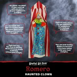 - Touch activated- Romero’s eyes flash blue, plays creepy circus music, terrifyingly greets guests