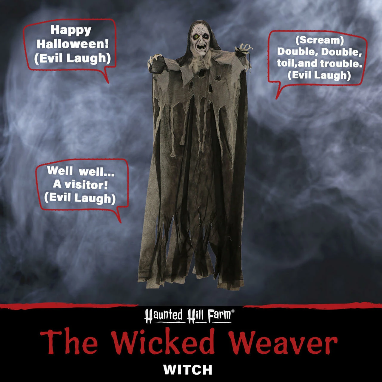 - The Wicked Weaver is touch activated- eyes light up multi colors, talks, laughs wickedly, storm sounds