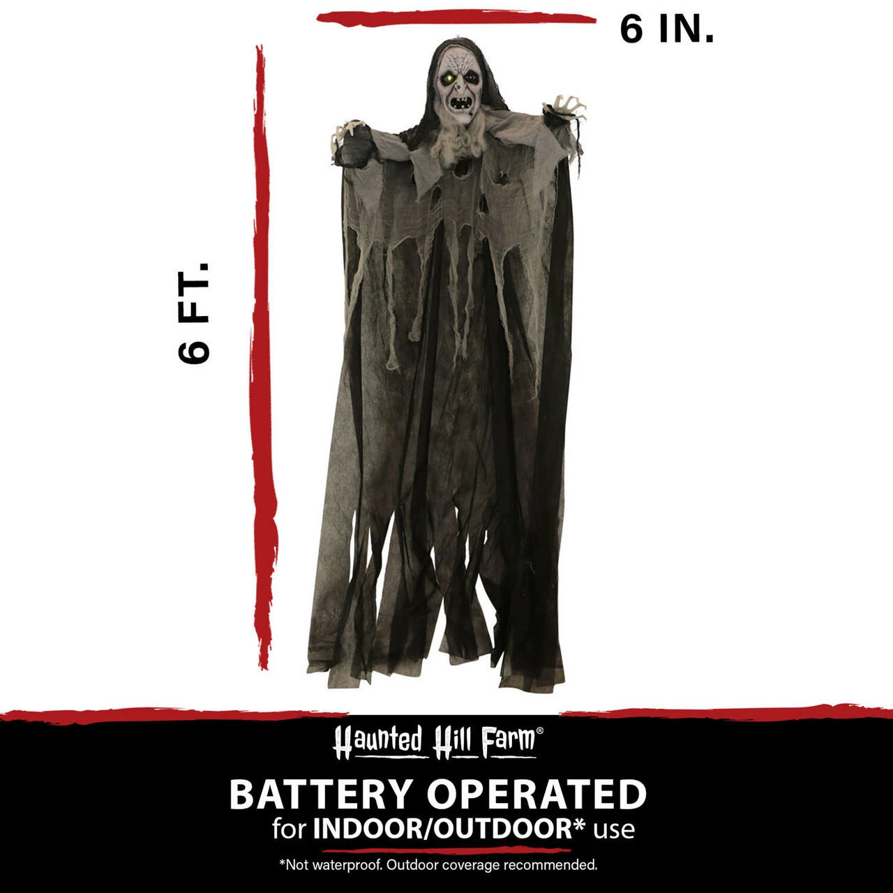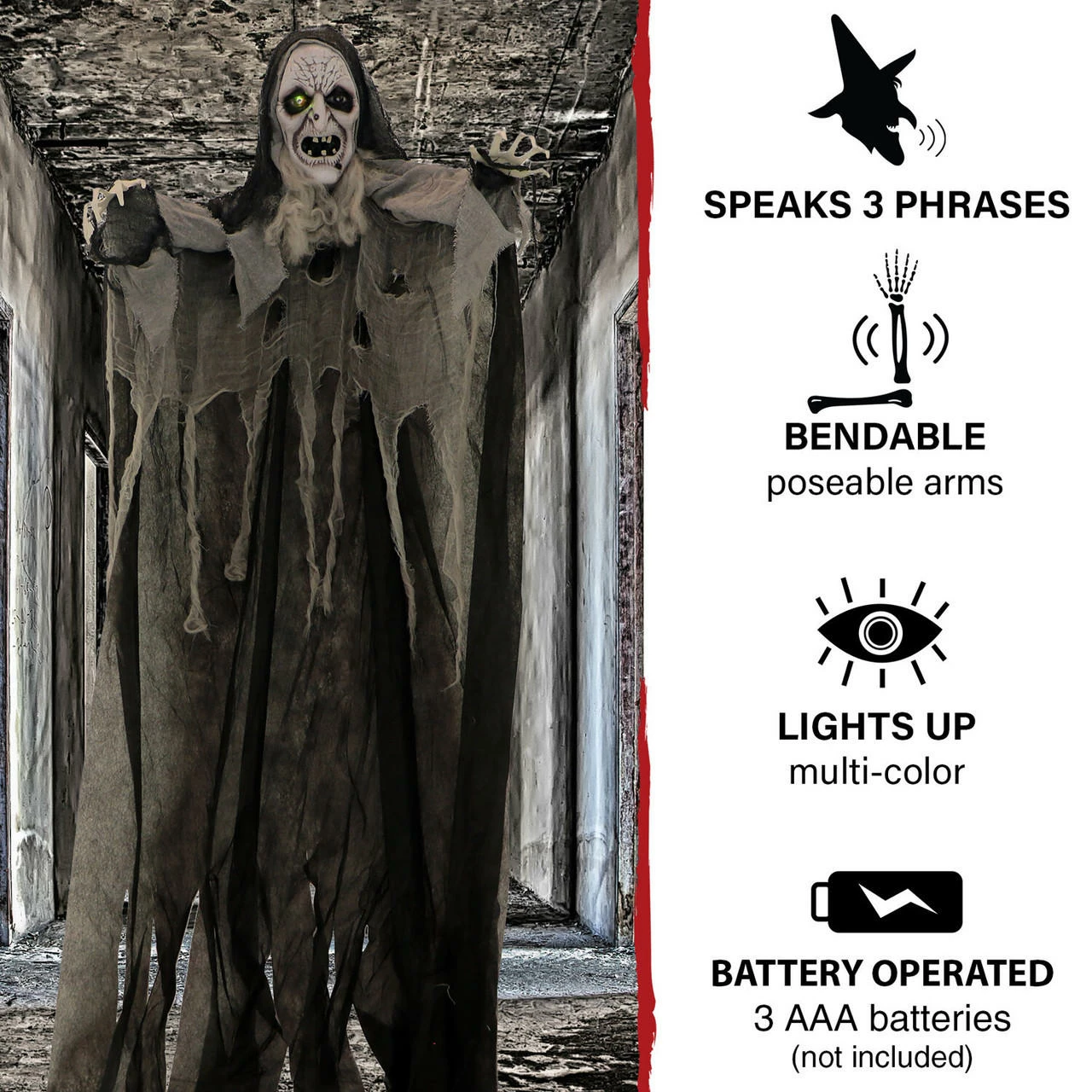 - 6-ft. hanging light-up witch with sound for indoor and covered outdoor display