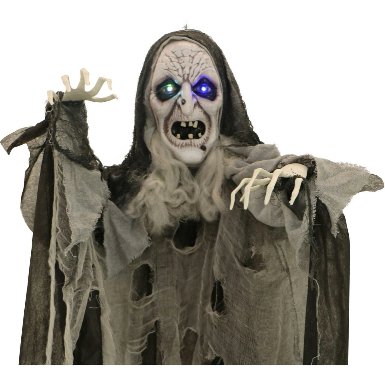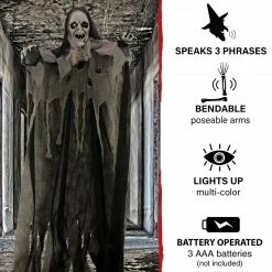 Be afraid. Be very afraid of Haunted Hill Farm’s Curses and Cauldrons Collection. These blood curdling creatures are sure to terrify any trick-or-treaters, co-workers, or customers. The Wicked Weaver is, well wicked. The cackling hag mocks visitors as her eyes light up an alarming array of colors. Even in the daylight, the Wicked Weaver’s ghastly appearance is frightening. Her black mouth hangs open in a sinister laugh, exposing her few scattered teeth. Her messy gray hair peeks out from her tattered hood and her body is draped in dark robes. The Wicked Weaver’s arms bend into a variety of scary positions and are finished with realistic hands and black fingernails. If you approach her, you can expect a spell to be cast on you. “Double, double, toil and trouble!, The Wicked Weaver says… Be the spook of the town this Halloween with Haunted Hill Farm!