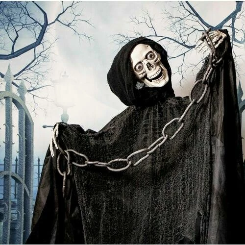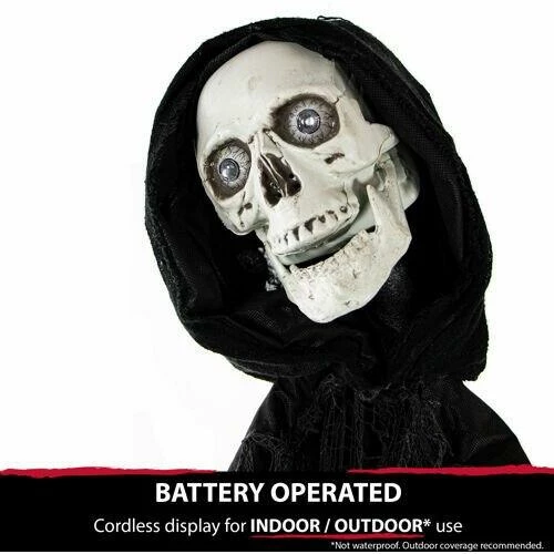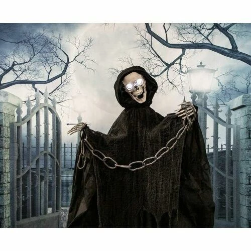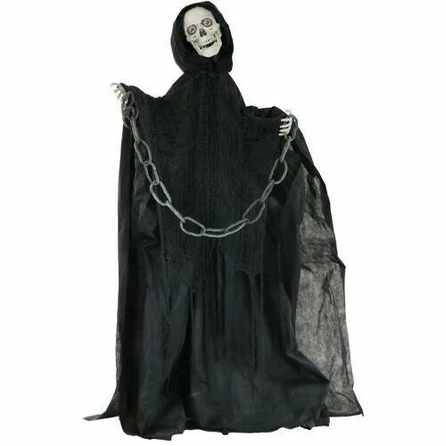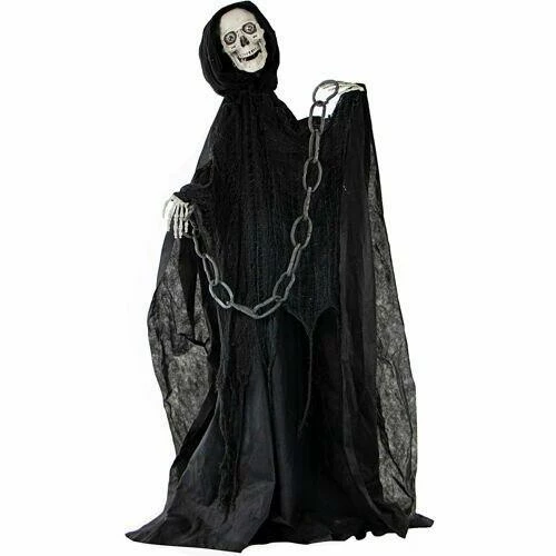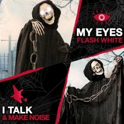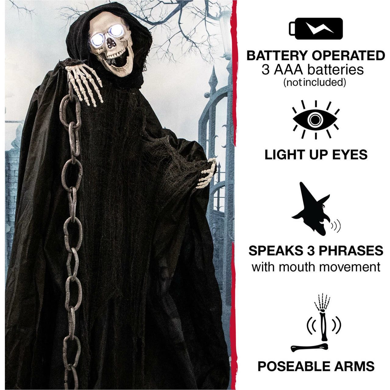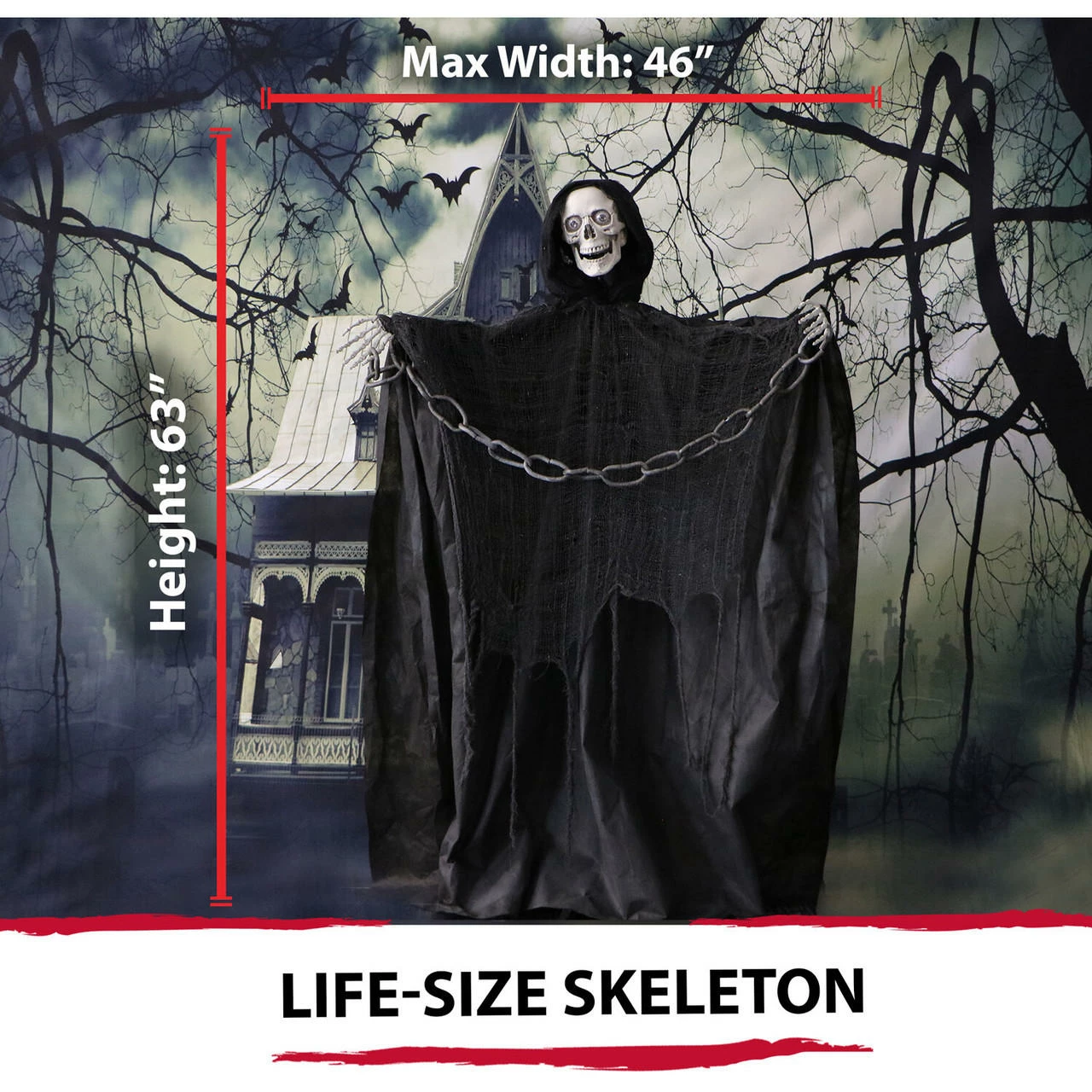 - 63-In. talking skeleton with a foam chain for a multitude of indoor and outdoor display ideas