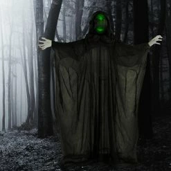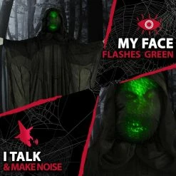 Be afraid! Be very afraid of Haunted Hill Farm’s Reaper Collection. These blood-curdling creatures are sure to terrify any trick-or-treaters, co-workers, or customers. Shadow is a fitting name for this beast. She blends into the darkness, masked beneath a black cloak, beckoning victims closer. Her eerie welcomes and thunder sounds will terrify any passerby. Concealed behind her robes, Shadow’s face is illuminated with green light, exposing her toothy evil smile and wicked gaze. Her poseable arms, complete with freakishly lifelike hands, bend into various positions. Keep an eye on Shadow as you roam the night. Enjoy yourselves, she says. It may be your last chance!