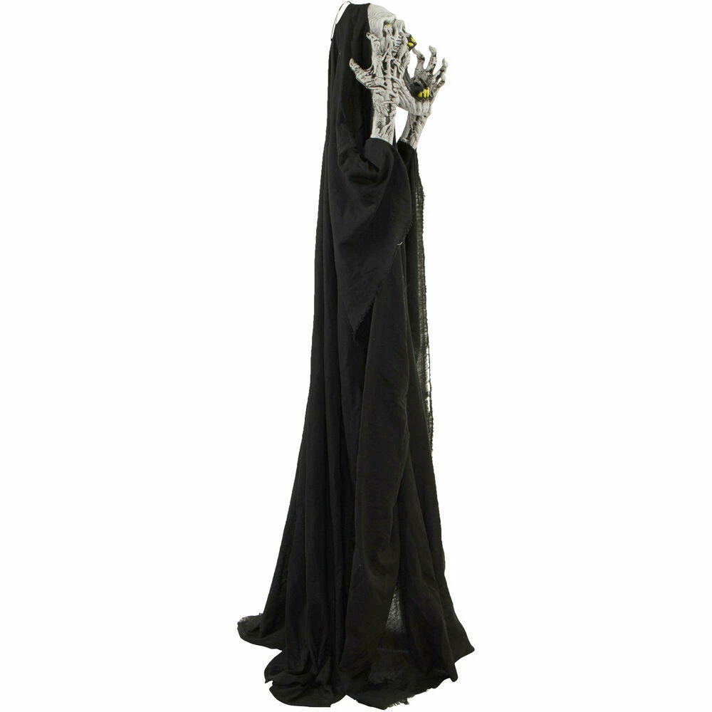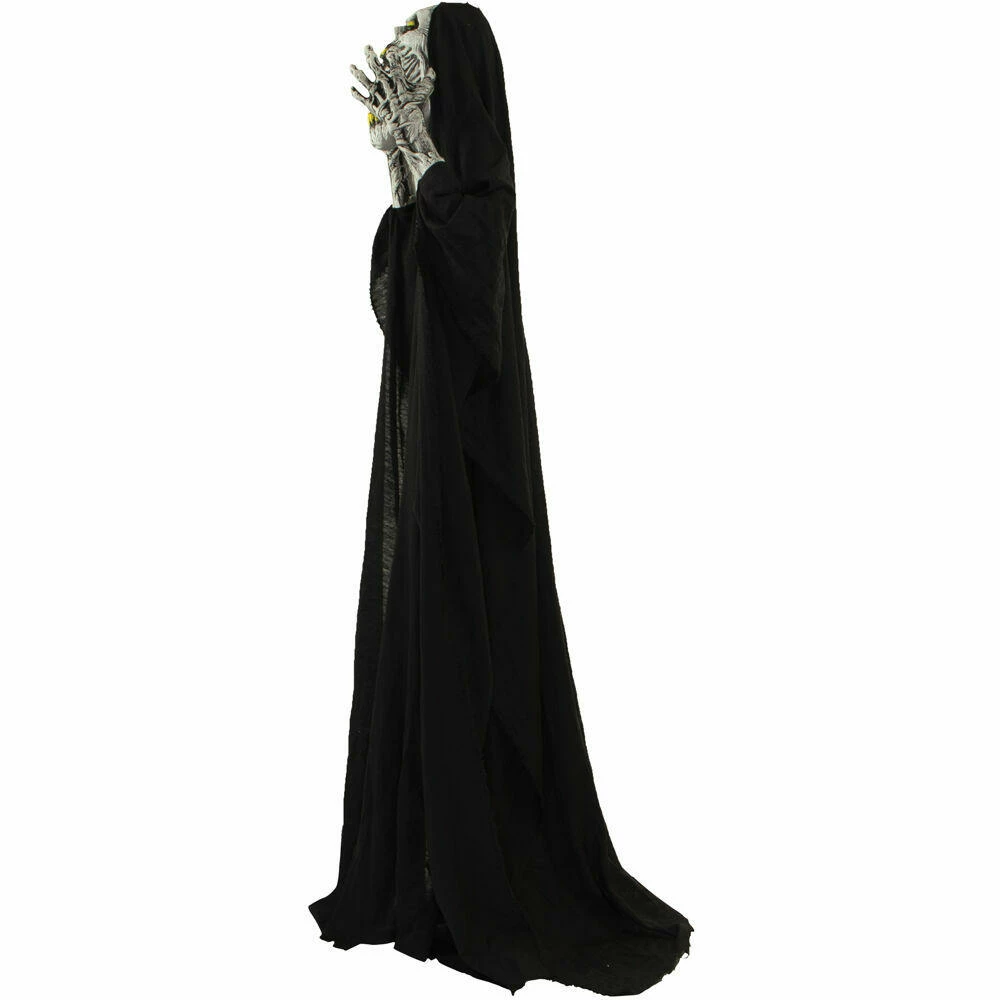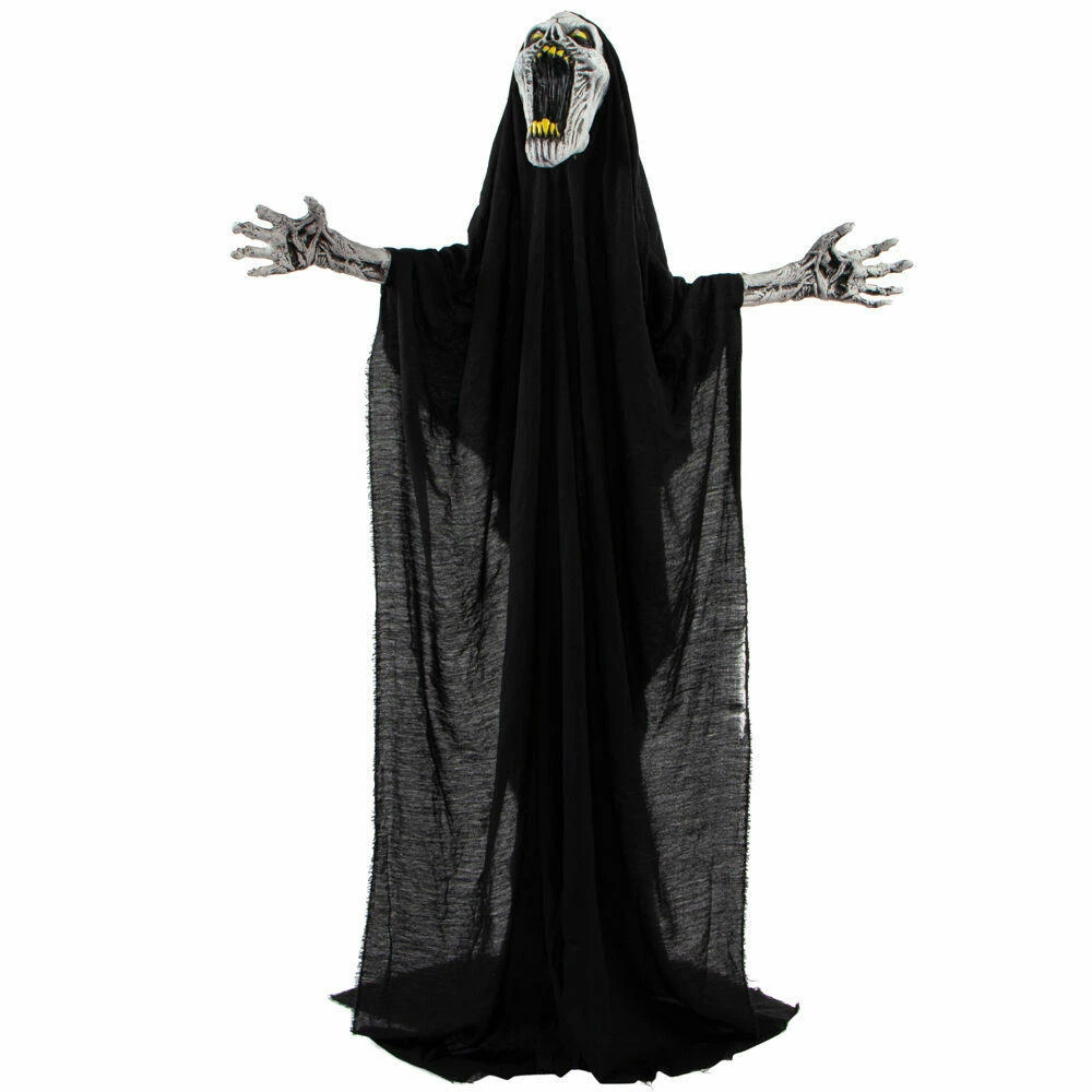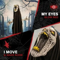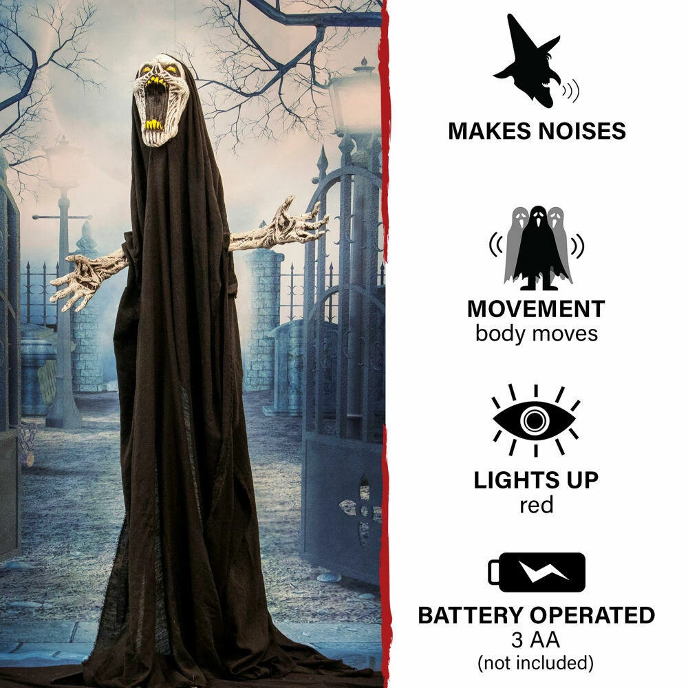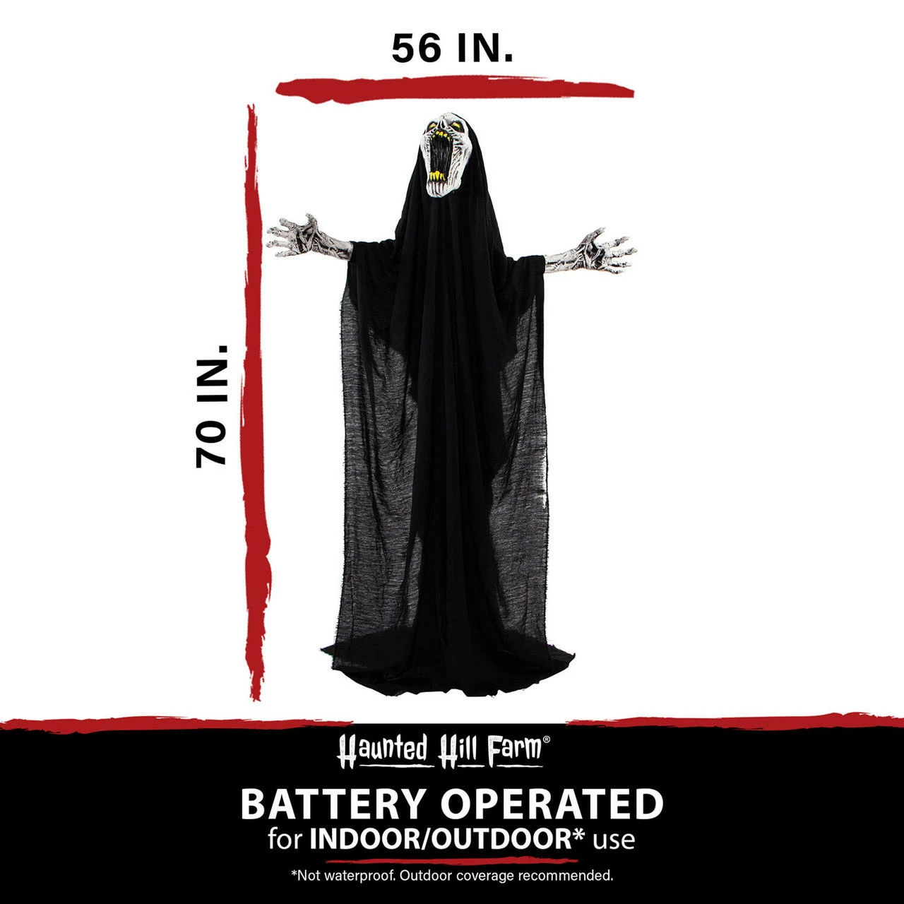 Be afraid! Be very afraid of the Reaper Collection from Haunted Hill Farm. Our blood-curdling reapers are just what you need to turn your home into the scariest house on the block. Squal, the howling reaper, is on a mission to collect souls! Often seen in October, his favorite day is Halloween, when many of his victims are trick-or-treating. Turn back before it’s too late! Bump activated, Squal features ghastly howling, glowing red eyes, and wild animated body-twisting. Battery operated with posable arms, he includes a stand and an optional hanging loop at the top of his head so you can display him however you want. Bring Squal home with you this Halloween to greet your trick-or-treaters with a scare that will surely give them nightmares.