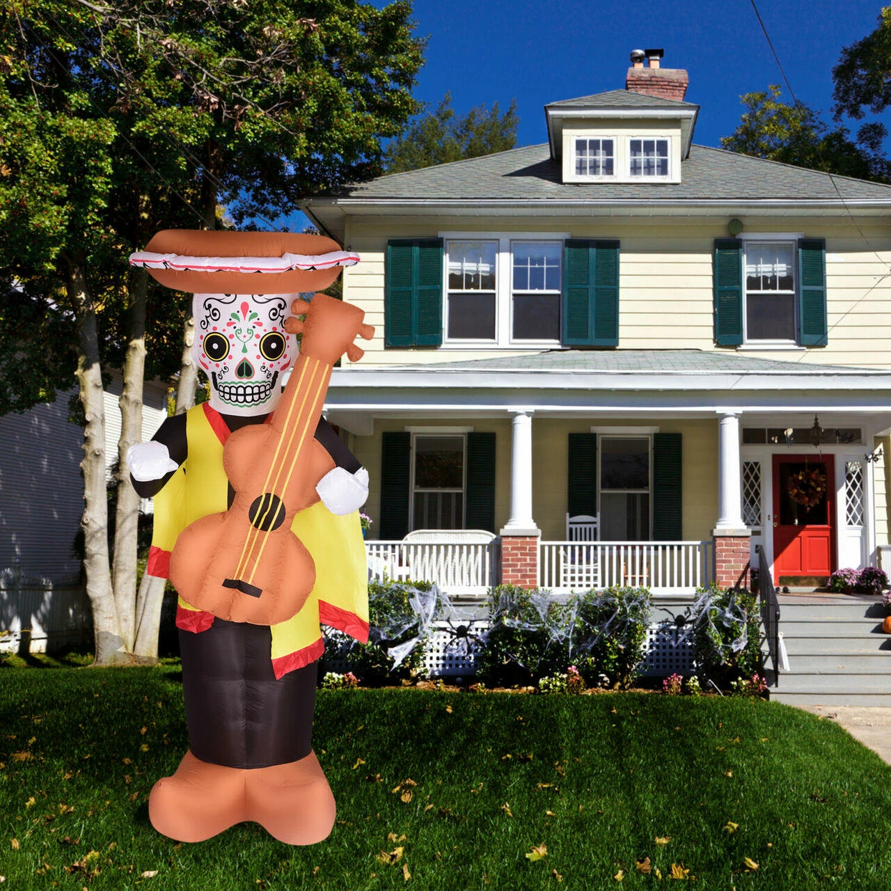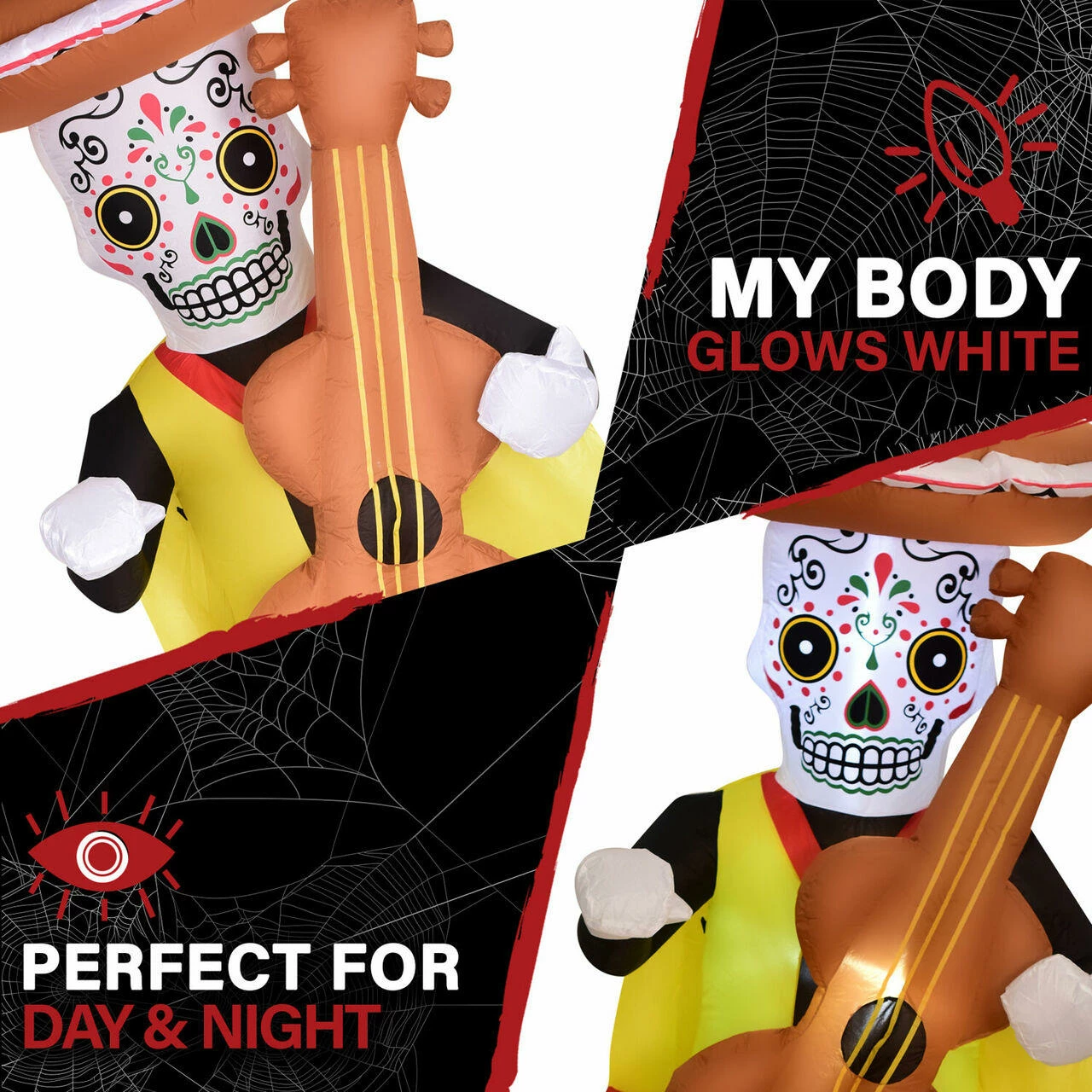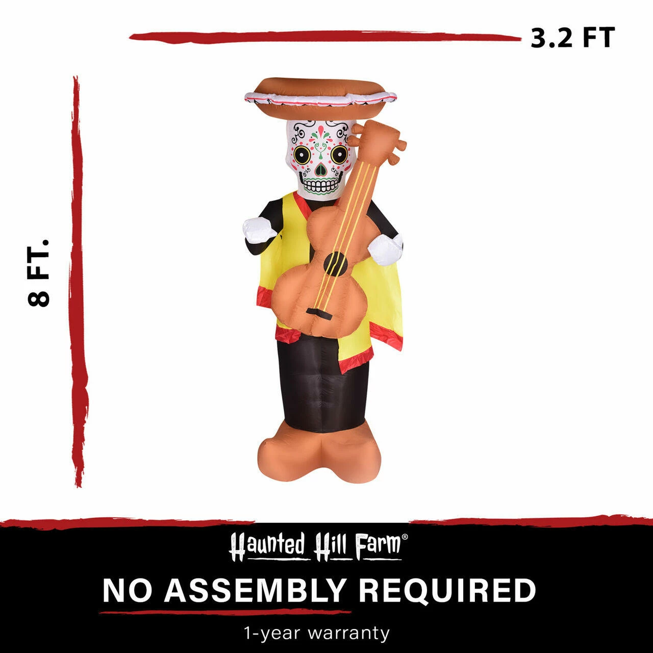 Celebrate Dia de los Muertos in style with this 8-ft. Inflatable Day of the Dead Calaca with Guitar. This pre-lit inflatable is outfitted with six internal white LED lights and will be the centerpiece to all of your festivities. It’s big enough to make the neighbors notice but still works in smaller yards or walkways. It’s quick and easy to set up with included ropes and lawn stakes for secure installation. Thanks to the internal lights and fan all you need to do is unpack it, plug it in, stake it down. Created out of durable, weather resistant polyester, you won’t need to worry about holes and your inflatable will last year after year. With Haunted Hill Farm, you’ll be ready for any celebration.
