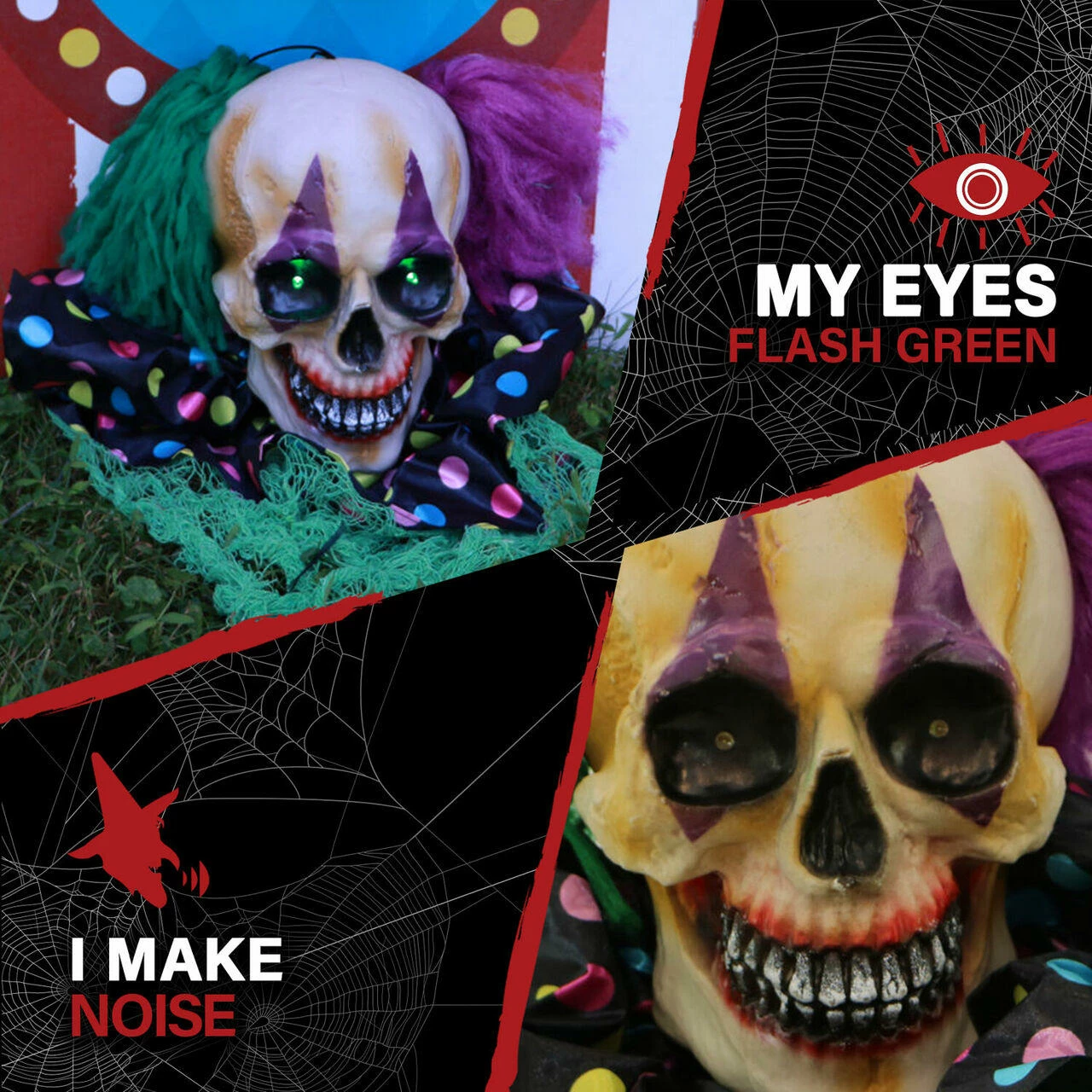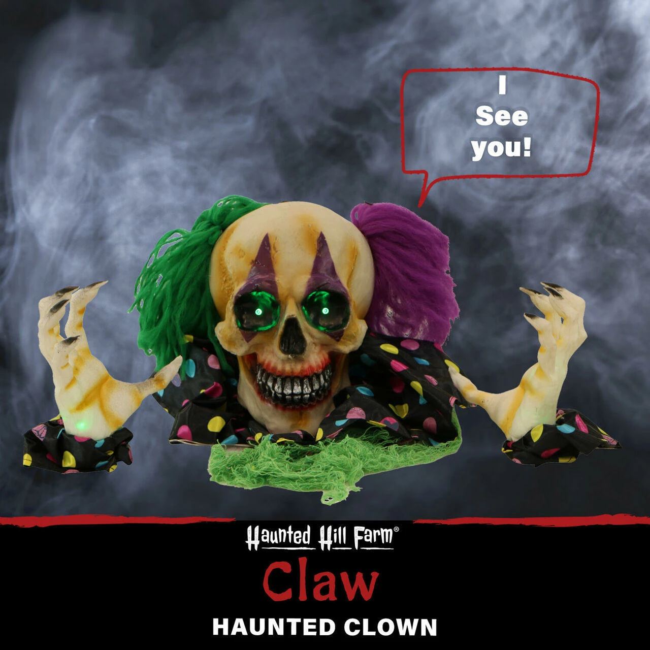 Be afraid. Be very afraid of Haunted Hill Farm’s Haunted Circus Collection. These blood-curdling creatures are sure to terrify any trick-or-treaters, co-workers, or customers. Claw the Skeleton Clown can’t wait to be part of your Halloween. This clown isn’t after laughs—he wants screams! As Claw emits menacing thunderstorm sounds, his eyes flash a gruesome green. He can’t help but move his body as he chuckles wickedly, far too pleased by the fear of foolish visitors. “I see you,” he’ll croon as guests reach for a treat. Hang Claw from your porch or nestle him alongside your Halloween candy; you’ll tempt only the boldest of trick-or-treaters.