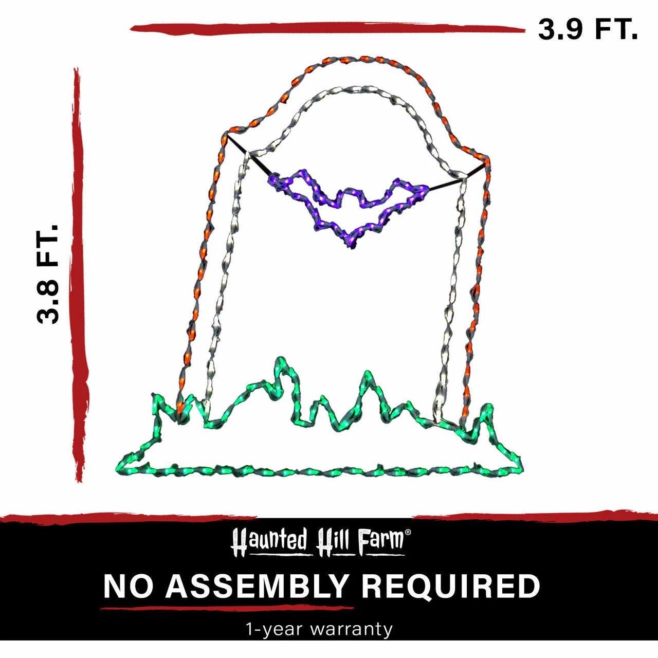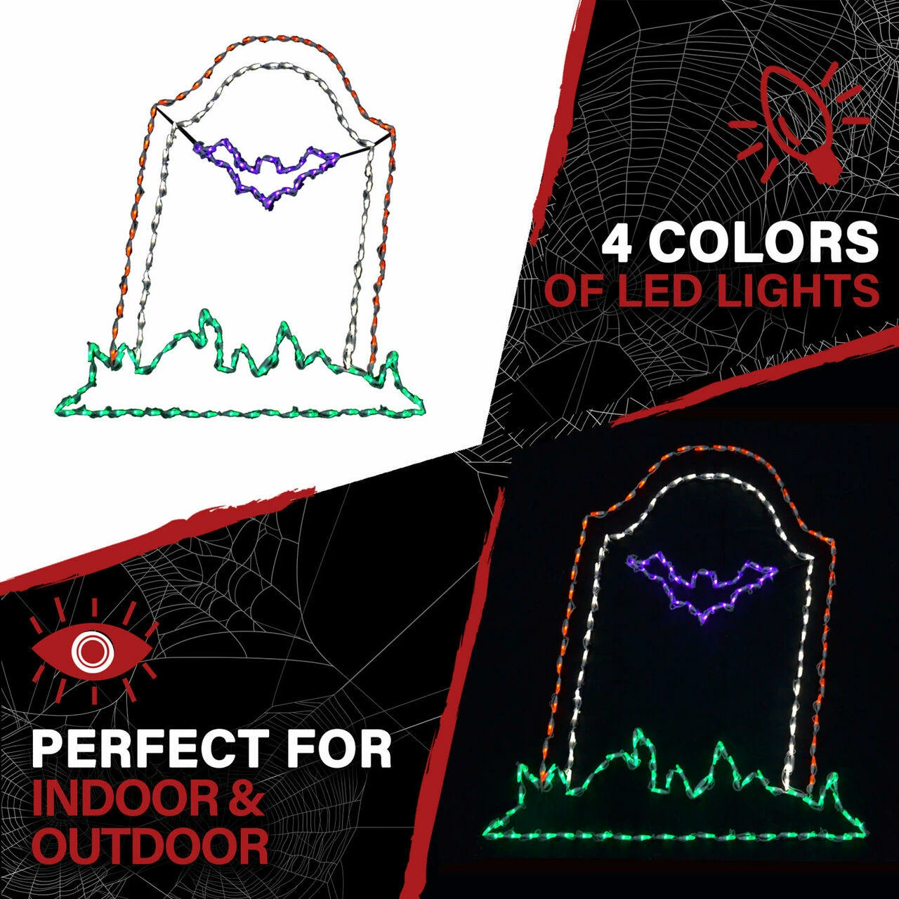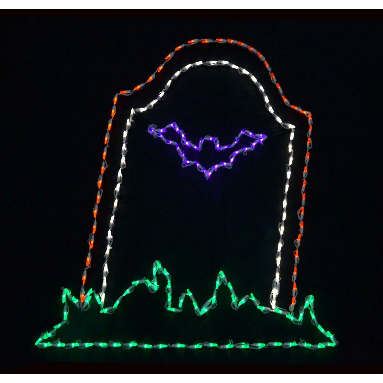 Light up the night with this giant Bat Tombstone light from Haunted Hill Farm! Our collection of spellbinding Halloween lights will help you create lots of eerie outdoor fun. Stake them on the lawn or mount them to the house for a frightfully spine-chilling decoration (stakes and other mounting hardware are NOT included). These pre-lit, weather-resistant shapes feature bright, faceted LED lights mounted on powder-coated metal frames to provide many years of happy haunting. Designed with 184 faceted lights, our tombstone is 47 inches wide by 46 inches tall. Pair it with our other spooky and scary lights (sold separately) to create a uniquely spirited display. For all your thrills and chills this Halloween season, count on quality products from Haunted Hill Farm.